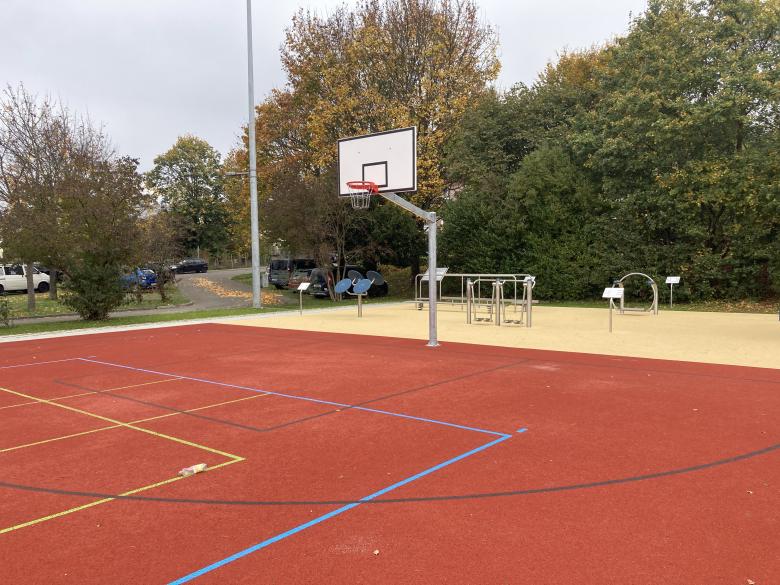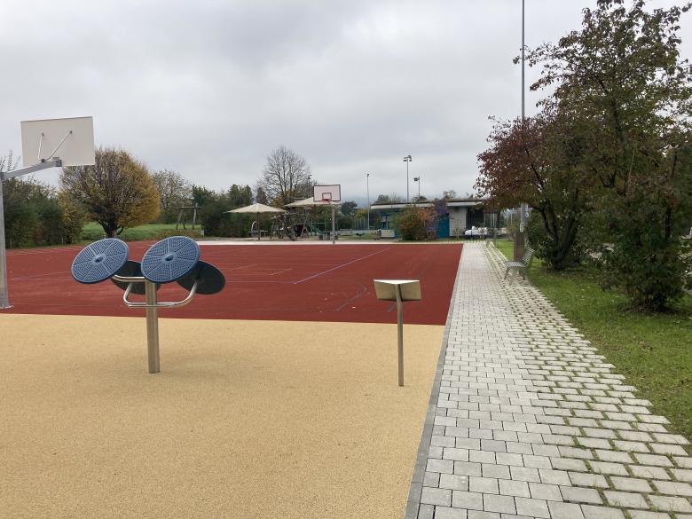 Der Kunststoffbelag beim Kombiplatz musste saniert werden. In diesem Zusammenhang wurde dieser Teilbereich der Sportanlage an die aktuellen Bedürfnisse der Nutzergruppen angepasst. Neben dem Ballsportplatz wurden Outdoor-Fitnessgeräte und eine Street-Workout-Anlage installiert. Im Übergang zum bestehenden Kinderspielplatz wurden Bodenspiele markiert. So finden alle Interessierten vom Kleinkind bis zu älteren Personen Anregungen für Bewegung und Sport, individuell oder zusammen.