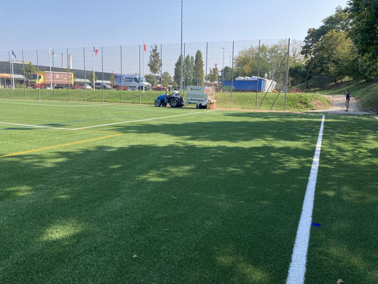 Ersatz des Kunstrasenbelags nach 12 Jahren. Anstatt der Kunststoffverfüllung wurde ein Korkgranulat eingebaut.