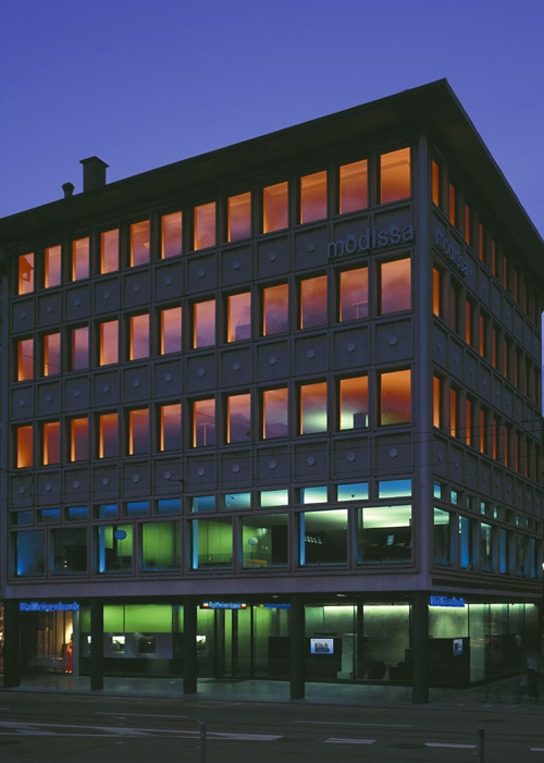 Diese Zurückhaltung in Farbe und Material, ihre Durchgängigkeit und Kontinuität ermöglichen dem Haus trotz Nutzungsvielfalt als ein grosszügiges Ganzes zu wirken. Die effektvolle farbige Nachtbeleuchtung in Anlehnung an die Raiffeisenfarben lässt die Zurückhaltung des Tages hinter sich und akzentuiert die Raiffeisenbank an ihrer prominenten Lage am Limmatquai.