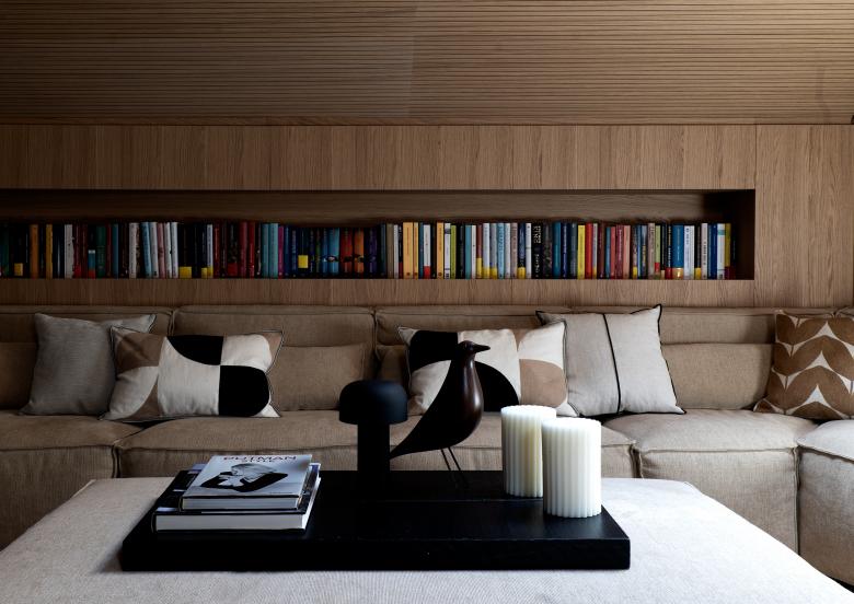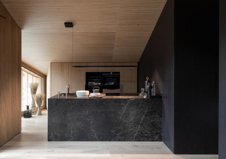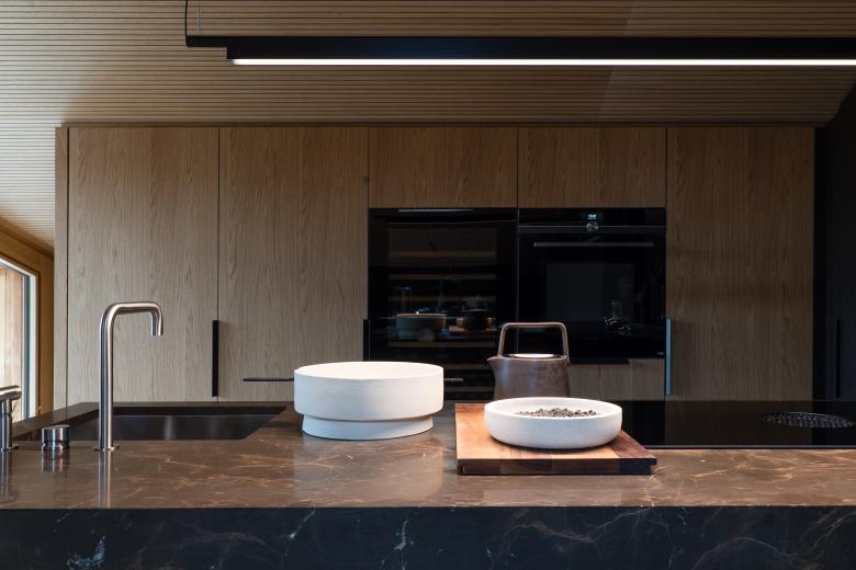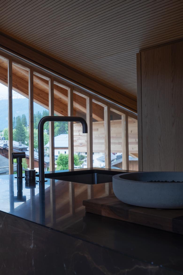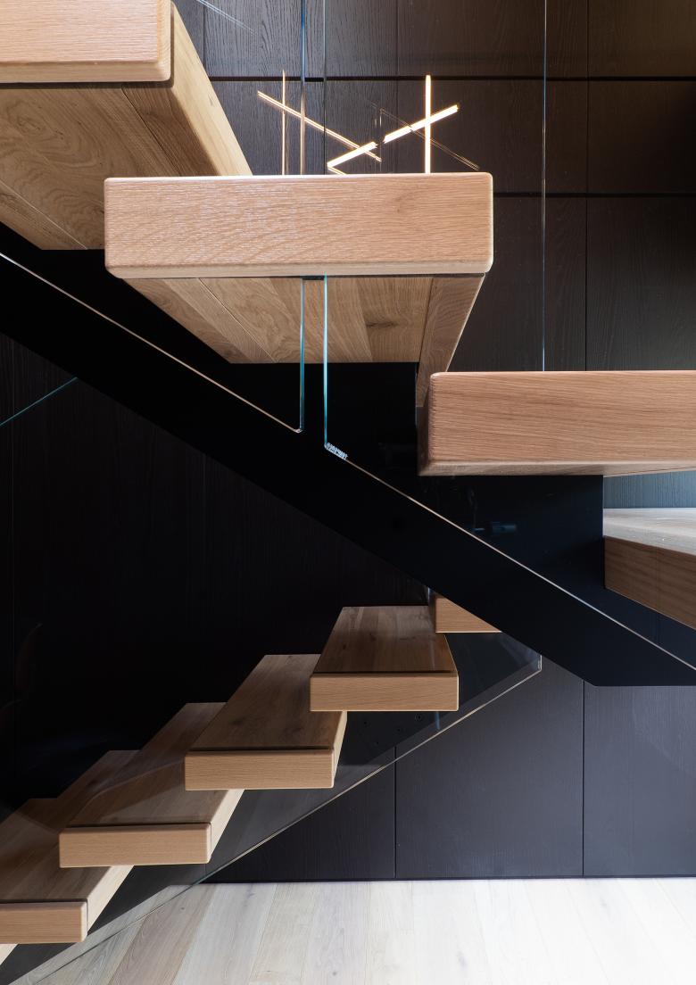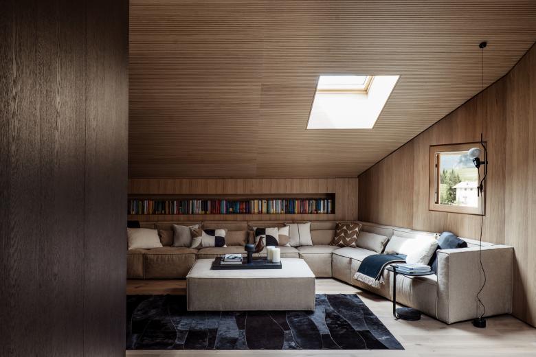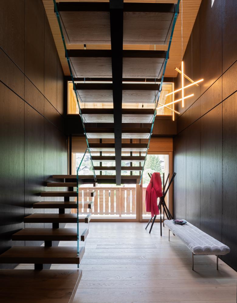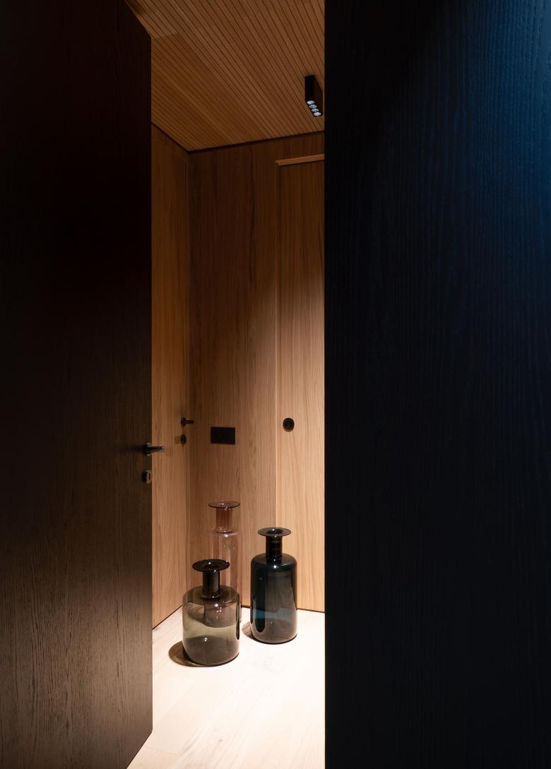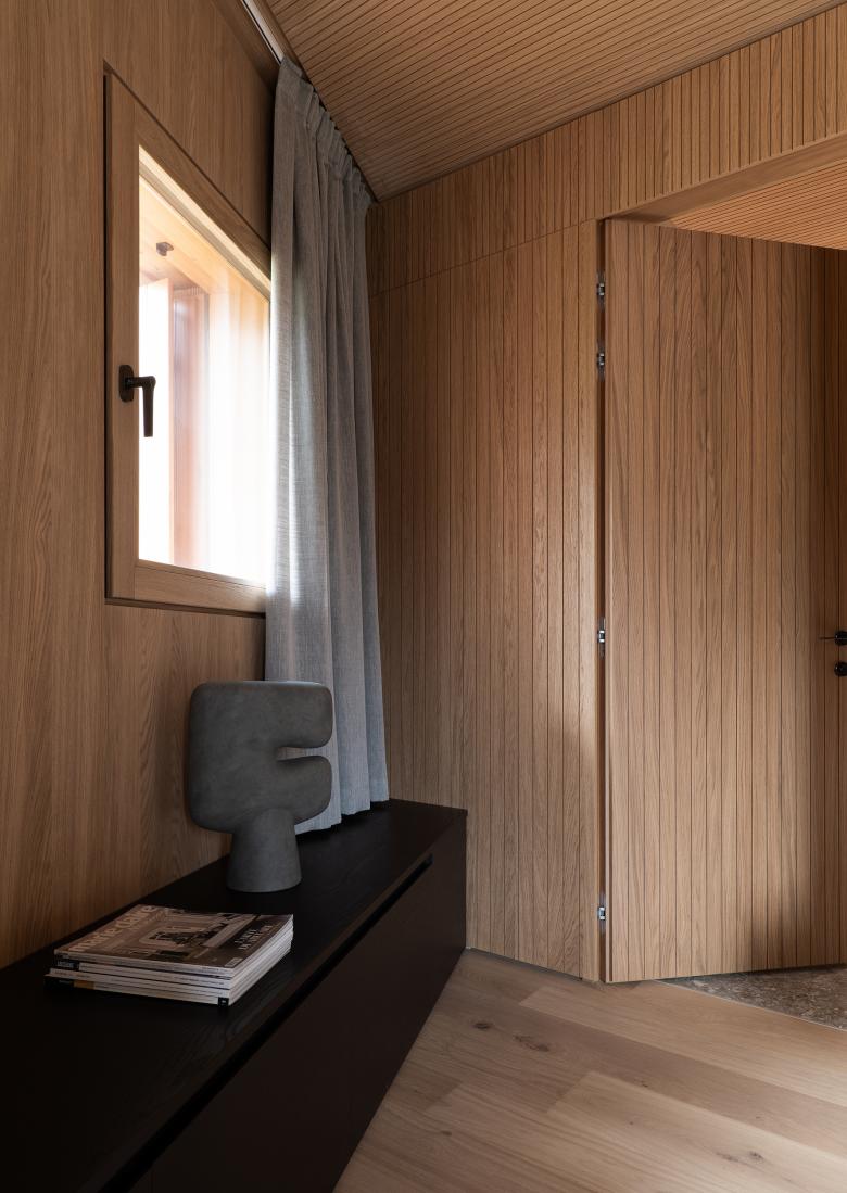 Gli elementi verticali principali sono rivestiti in rovere wenge, mentre controsoffitto e boiserie lungo i muri perimetrali sono rivestiti in rovere naturale. Nei bagni il rivestimento è in ceppo di gre, in contrapposizione alle tinte calde degli ambienti living.