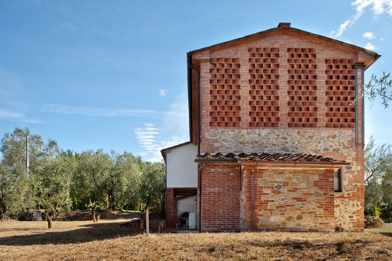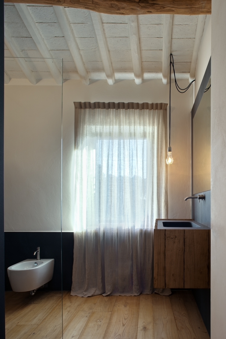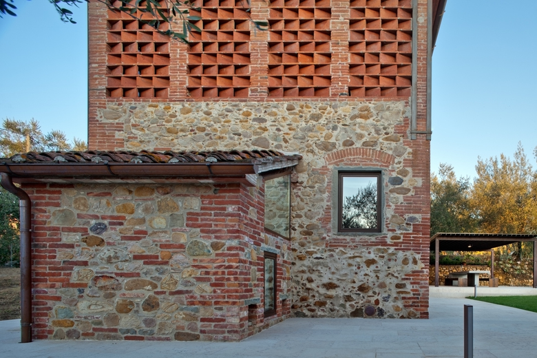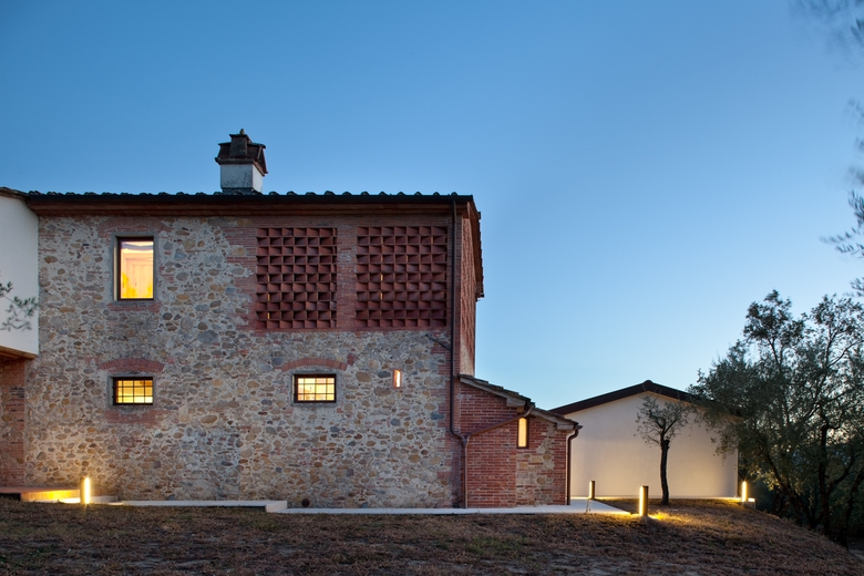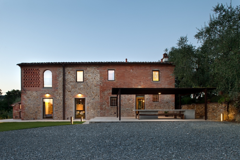tramite sabbiatura è un esplicito richiamo alla tradizionale architettura interna toscana, attualizzata mediante la sbiancatura dei soffitti. L’esterno dell’immobile è stato volutamente conservato inalterato nelle superficie e nelle forometrie al fine di mantenerne la storicità senza intaccarne il fascino, pertanto si è optato per degli infissi esterni in acciaio dal profilo estremamente contenuto.