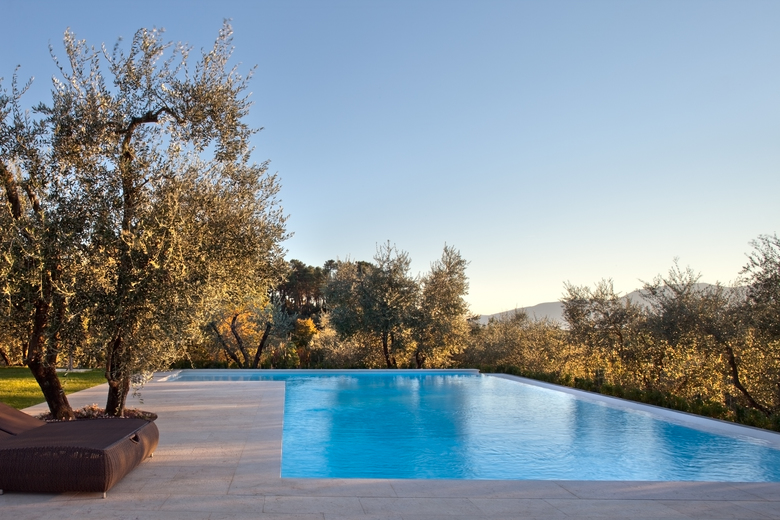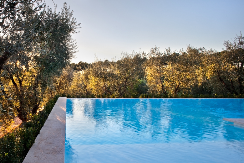 Nel giardino l’ampia piscina s’inserisce in piena armonia con il paesaggio circostante, dove il disegno delle pavimentazioni di pertinenza rispetta la vegetazione e gli ulivi secolari presenti lasciandone inalterata la posizione.