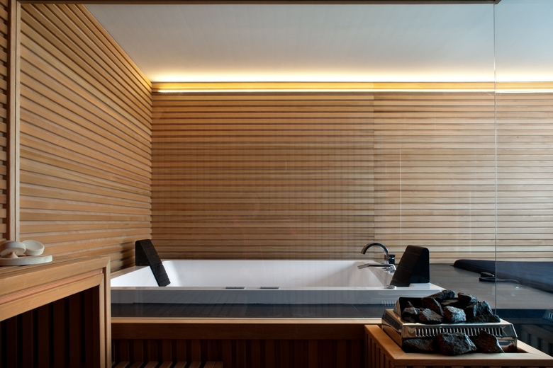 Il vicino volume del tirasotto, anch’esso pre-esistente, è stato totalmente ristrutturato internamente, optando in questo caso per materiali e colori contemporanei, dove il pavimento in calcestruzzo ed il blocco nero a sevizi contribuiscono a dare nuova identità. Nel piano ipogeo infine, trova luogo uno spazio relax attrezzato con una spa composta da una generosa vasca idromassaggio ed una sauna in legno di cedro.
