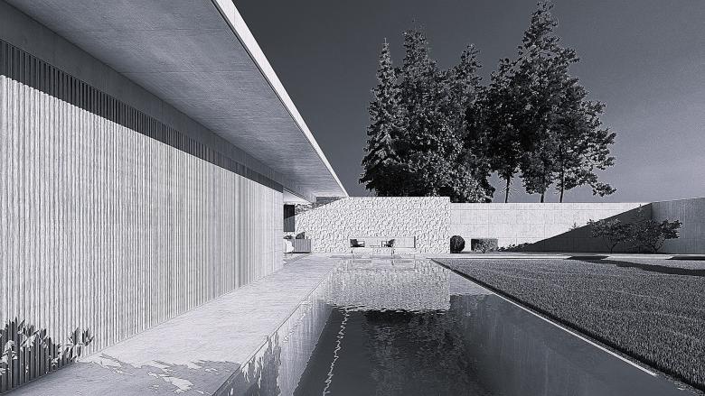 A sense of calm and refinement. A garden frames a place, which becomes sacred through the simplicity of its forms. The villa seems nestled into the mountain; the land, a terrace overlooking the sea, opens up, allowing for a view of infinity. The villa opens to the south, where a pool and garden extend from the interior. Interior and exterior unite and are protected by a concrete blade that appears to rest on the rock, protecting the villa and framing its spaces.
