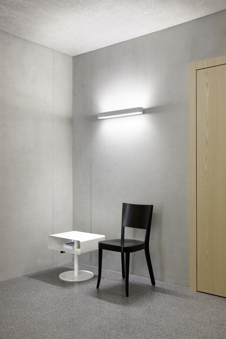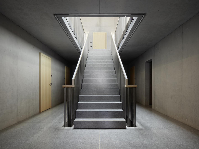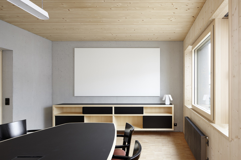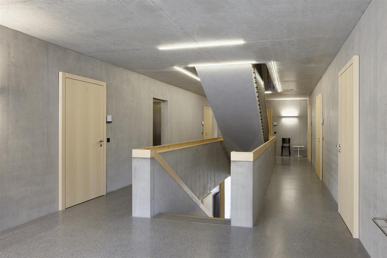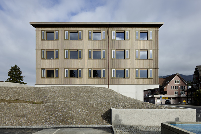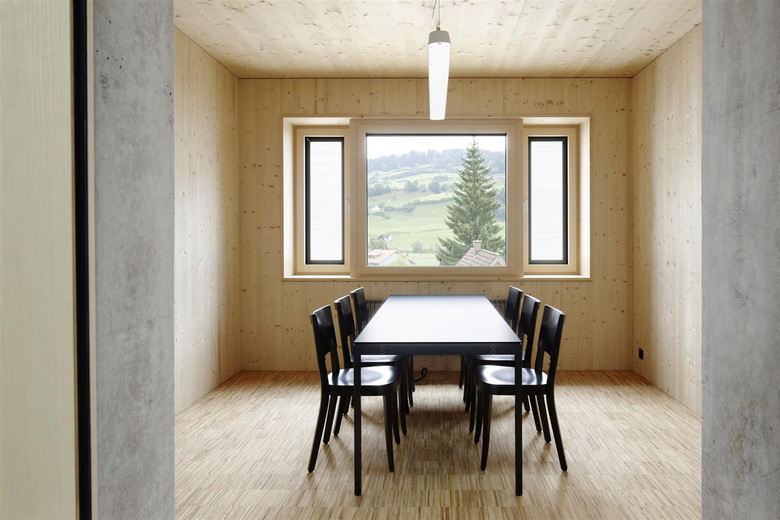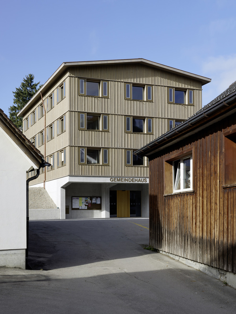 Das Gemeindehaus besteht aus dem Sockelgeschoss und einem zentralen Treppenkern aus Beton, umschlossen von einer dreigeschossigen Holzkonstruktion. Deren Aufbau ist modular und beinhaltet die 15 m2 grossen Büros und die doppelt so grossen Sitzungszimmer.
