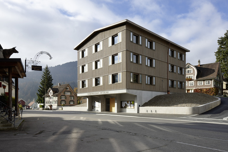 Das neue Gemeindehaus von Nesslau bildet zusammen mit dem historischen Nüsslihaus, dem neu gestalteten Hof und dem Geräteschopf ein Ensemble, welches Alt und Neu als Einheit erleben lässt.