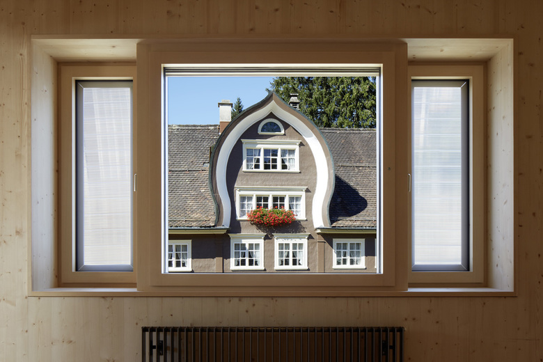 Das prägende Element der Fassade sind die speziellen Fenster. Diese bestehen aus einem quadratischen Mittel- und zwei Seitenflügeln. Der Mittlere rahmt den Ausblick der Büros. Die Seitlichen sind eine Hommage an traditionelle Fensterläden und dienen der indirekten, solaren Energiegewinnung.