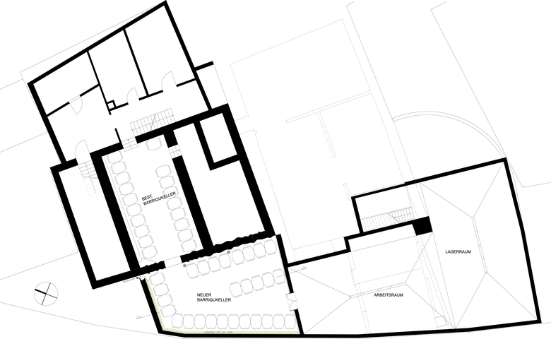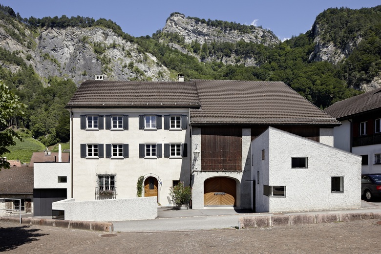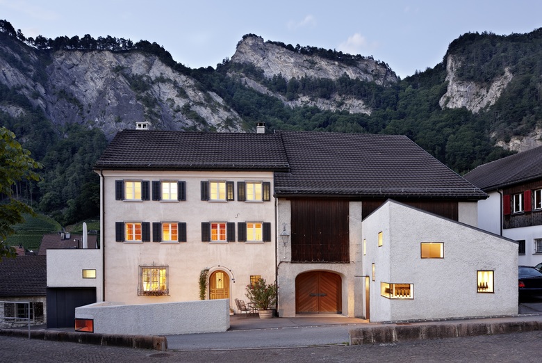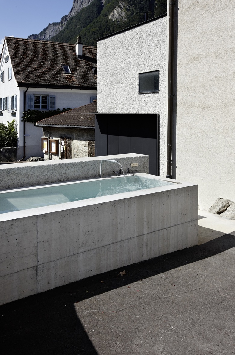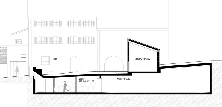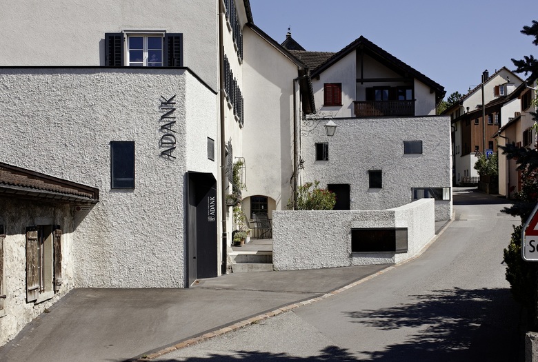 Das beschauliche Weindorf Fläsch liegt in einer zum Rheintal hin nordwestlich geöffneten Senke. Die locker zueinander stehenden Häuser verdichten sich um den Dorfbrunnen und sind gekennzeichnet durch schweres, hell verputztes Mauerwerk mit rhythmisch gliedernden Fensteröffnungen. Den Weingütern sind kleine Höfe hinter Torbögen vorgelagert, Spaliere beleben die Hauswände. Wie bau man modern in solch einer Idylle? Hansruedi Adank und seinem Architekten Kurt Hauenstein, der in einem Nachbarhaus sein Atelier hat, ist dies bestens gelungen. Neben dem alten Wohnhaus mit dem gewölbten Fasskeller in Naturstein entstand aus einer alten Remise der Verkostungs- und Verkaufsraum, zusammen mit einem Vorplatz, der mit einer niedrigen Mauer und einem Brunnen den Hof neu und in moderner Frische gestaltet. Er bildet einen einladenden halböffentlichen Raum an der Dorfstrasse. Auch die Lochfassade der umliegenden Häuser wurde auf geistvolle Weise neu interpretiert. Obgleich die Anbauten in ihrem Massstab und Volumen den Eindruck erwecken, als hätten sie schon immer zum Ortsbild gehört, so entwickeln die bündig ins Mauerwerk gesetzten neuen Fenster in ihren schmalen Stahlrahmen eine besondere ästhetische Dynamik, die fröhliche Leichtigkeit vermittelt und zusammen mit dem offenen Vorplatz zum Eintreten einlädt. Hat man sich aussen noch gefragt, welche Funktion die unterschiedlich gesetzten Fenster für den Innenraum haben , so zeigen sich innen die verschiedenen Ausblicke und eine klare Belichtung, die den Wein bei der Verkostung gut zur Geltung kommen lässt. Eines der Fenster gibt sogar dem schönen Barrique-Keller Licht über Eck und erinnert damit an die Belüftungsschächte im benachbarten Gewölbekeller. Durch ihn gelangt man in den anschliessenden Gärkeller, in dem sich neben den neuen Edelstahltanks auch noch die heute nicht mehr erhältlichen Stahltanks mit Innenbeschichtung befinden. Der Winzer schwört, dass in diesen Tanks die Weine bei der Vergärung einen weicheren Ton als im Stahl erhalten. Alt und Neu haben sich hier in Funktion und Architektur offenbar perfekt zusammengefunden.