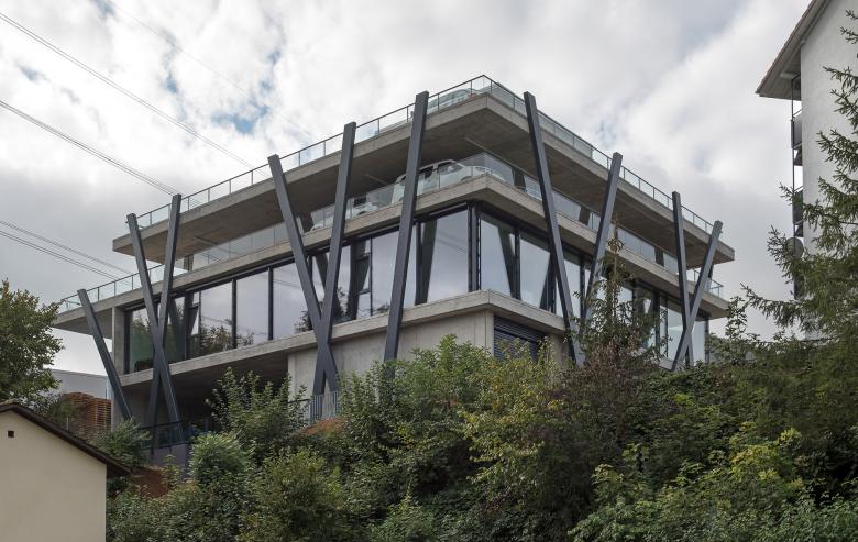 Für Aufsehen sorgen nun eine ca. 6 Meter weit auskragende Betondecke über dem ersten Obergeschoss und riesige schräge Stahlstützen, die sowohl das Fassadenbild wie die Innenräume prägen. Erschlossen wird das Parkhaus über eine Treppe und einen Auto-Lift.