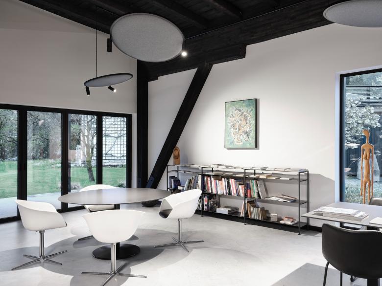 Im eigenen Büro setzte Michael Egger selbstverständlich auch auf Nachhaltigkeit und Flexibilität und entschied sich bezüglich der Beleuchtung und Raumakustik für das modulare Hybrid-Profilsystem Soliscape von Delta Light, da es Hocheffizienz mit sinnvollem Materialeinsatz verbindet. Denn der Werkstoff der integrierbaren Akustikpaneele besteht zu mehr als 60 Prozent aus recycelten PET-Flaschen und die Reflektoren für die professionelle Beleuchtung der Arbeitsplätze weisen eine ausgezeichnete Energiebilanz auf.