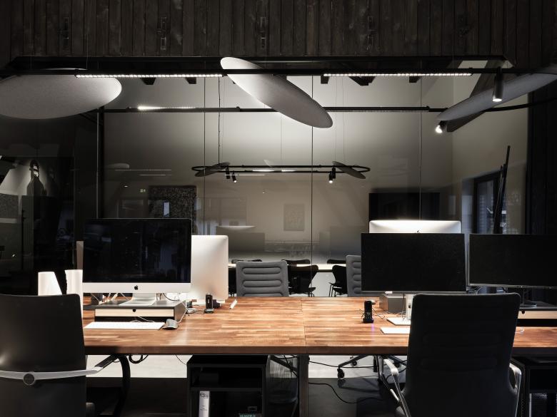 Über dem für sechs Mitarbeiter ausgelegten Team-Arbeitsplatz schwebt ein Soliscape-System, das mit jeweils dimmbaren stark entblendeten direkt und indirekt strahlenden Lichtlinien sowie mit justierbaren Spots mit Abstrahlwinkeln von 45° für Licht zur Allgemeinbeleuchtung und zum Arbeiten sorgt. Vier spielerisch diagonal in das System integrierte Akustikpaneele reduzieren den Nachhall des hohen, mit schallharten Oberflächen versehenen Raums und tragen damit zur Schaffung eines ruhigen Arbeitsumfelds bei. Eine zweite kleinere Konfiguration beleuchtet den mit einer Glaswand abgetrennten, für acht Personen ausgelegten Besprechungsraum mit integrierten Lichtlinien und vier Spots. Hier sorgen zwei Akustikpaneele für eine ruhige Umgebung. Über weiteren kleineren Arbeits- und Multifunktionsplätzen wurden mit Spots bestückte Soliscape Akustikpaneele als Einzellösung abgependelt.