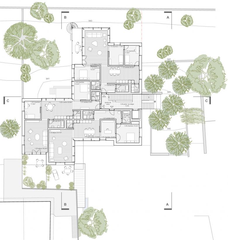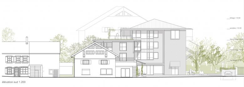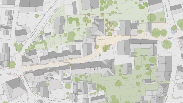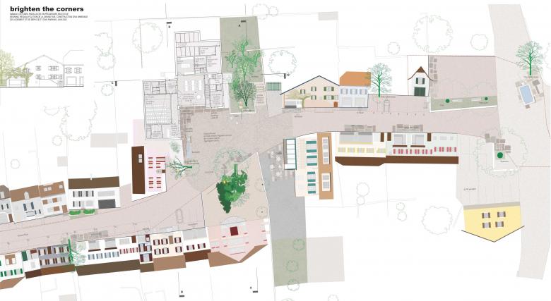 Begnins, ein Winzerdorf an der AOC La Côte am Lac Léman zwischen Lausanne und Genf, hat eine zentrale Strasse, in der die Zeit stehen geblieben ist: die Grand' Rue. Der neue Dorfplatz ist als fliessender, sich erweiternder, atmender Raum im Herzen der Grand' Rue konzipiert. Dieser Raum wird durch eine Ecke im Nordwesten gefasst, in welchem das neue kommunale Wohngebäude von GayMenzel Architekten gebaut wird. Ein grosses «Baum-Bouquet» ist als Dreh- und Angelpunkt positioniert und prägt die Identität des Ortes als grüne Präsenz. In ähnlicher Weise stellt die Strasse Verbindungen zu den Gärten seeaufwärts und -abwärts her und verbindet den Jura-Südhang, zu dem ein Fussgängerweg vorgeschlagen wird. Eine aus grossen Kalksteinplatten bestehende Zone lockert die durchgehend Jurakalk-gelbe Strasse auf und hebt Eingänge geschäftlicher oder privater Liegenschaften hervor.