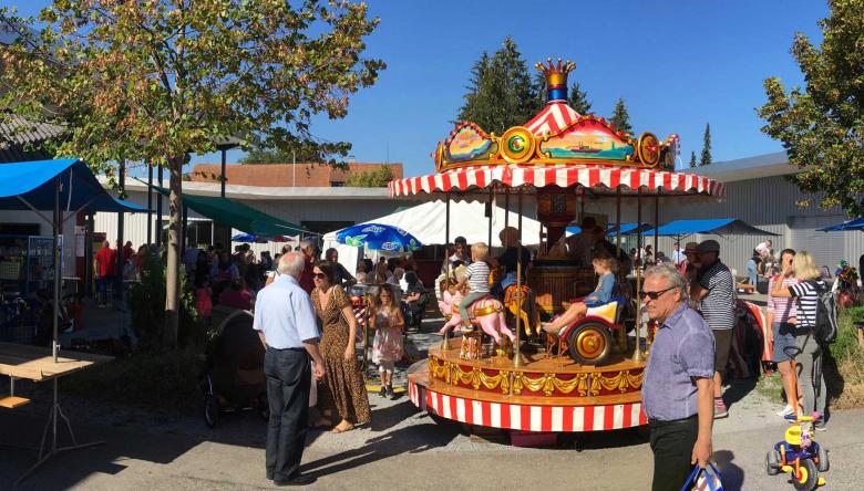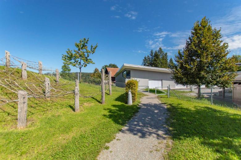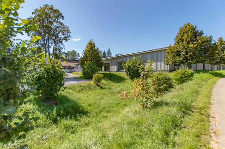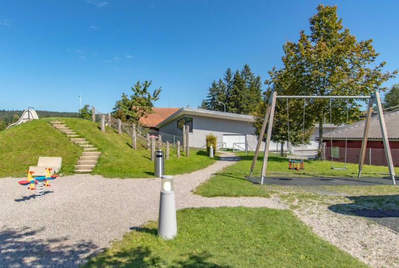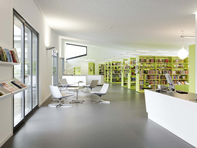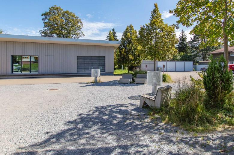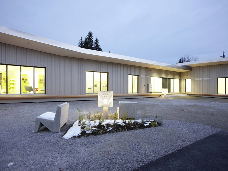Nach dem Entwurf von Drexler Guinand Jauslin Architekten ist ein größerer Freizeitdienst und eine Bibliothek entstanden. Der bestehende Chramschopf fügt sich mit seinem neuen Vordach optimal ins Ensemble ein. Zwischen den drei öffentlichen Gebäuden spannt sich ein wohnlicher Platz auf. Die Bibliothek und der Freizeitdienst sind jeweils in einem Flügel des L-förmigen Neubaus untergebracht und werden durch den platzseitigen Eingangsbereich und die gemeinsam genutzten Räume verbunden. Das zentrale Anliegen, den Bezug zum Außenraum herzustellen, wird durch die allseitig bodenhohen Fenster unterstützt. Die eingeschossige Architektur erlaubt eine einfache Bauweise ohne Treppen, Aufzüge und aufwändige Fluchtwege. Das Projekt konnte in Holzbauweise umgesetzt werden.