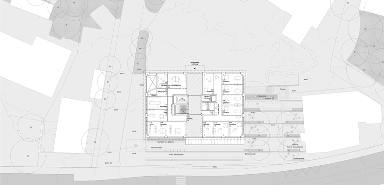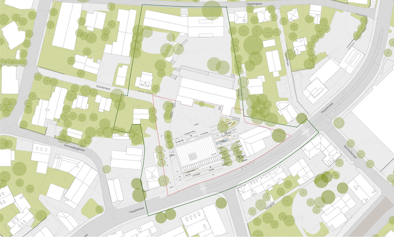 Ein einheitlicher Belag aus Asphalt wird mit linearen Naturstein-Einlagen ergänzt und verbindet die unterschiedlichen Nutzungsbereiche mit einer dezenten Freiraumgestaltung. Sie unterstützt die Setzung des Neubaus und schafft eine selbstverständliche Ordnung im dörflichen Massstab. Die Doppelreihe hochstämmiger weiss blühender Robinen (Robinia pseudoacacia) bildet zusammen mit linienförmigen Rabatten aus Blütenstauden in Rot auf weissem Grund eine gestaffelte Kulisse für die unterschiedlichsten Auftritte der diversen Akteure im öffentlichen Raum. Der schlichte aber einladende Freiraum ist beweglich möbliert - er bildet Gemeinschaft und bietet gleichzeitig individuellen Platz für Entfaltung. Er unterstützt die Architektur, definiert aber auch eine eigene Qualität im grösseren dörflichen Kontext.
