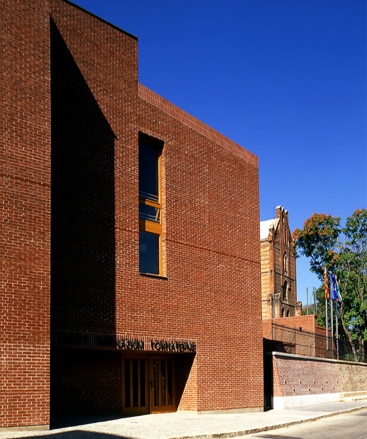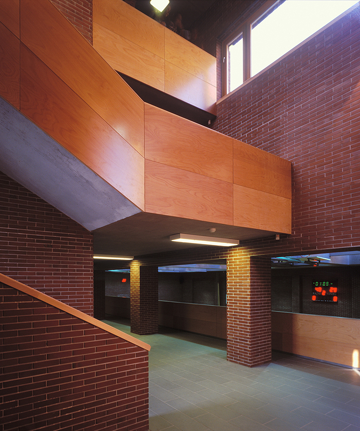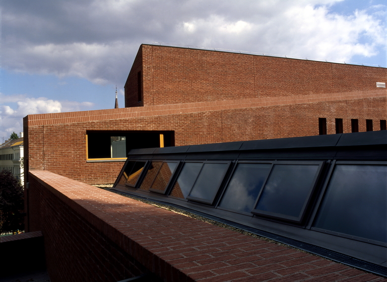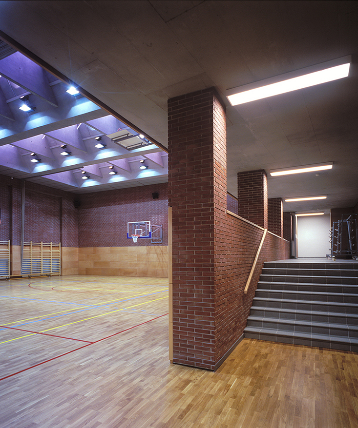 Because of the steepness of the castle slope, we put much effort in dealing with the plans of civil engineering. A system of pile walls, drainages and monolithic concrete foundations ensure the stability of the neighboring buildings and the movement of ground-waters. The load-bearing structure of the gymnasium is monolithic concrete. The covering of the façade is hand-laid Röben-brick. Brick coverings rule most of the surfaces inside, as well, like in the old high school building. The ceilings are bare concrete, the covering of the roof is anthracite-grey roof tiles. The door- and window frames are made from natural colored wood, the special sport-floor of the gymnasium was ordered from Sweden- its flexibility protects the joints of the students.