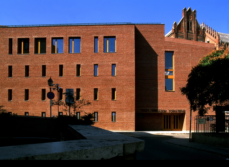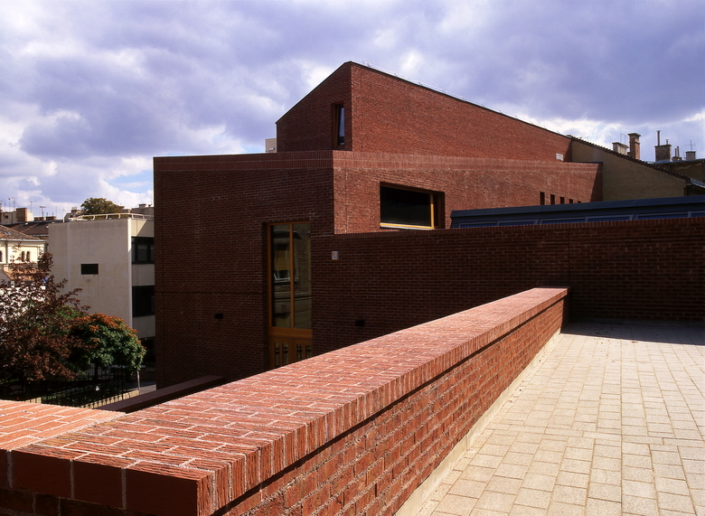 The enchanting old building of the high school was built in 1859 in neogothic style. The neighboring site on the castle slope of Buda was pointed out as building site. The building of the gymnasium consists of four functional units- the gymnasium itself, the corridors, the changing rooms and the medical room. The gymnasium was hidden under ground level. Skylights were created above, therefore it is sunny and light inside. The conic passageway is connected to the gymnasium and functions as the grandstand, as well. The changing rooms, the offices and the staircase opening from the passageway are situated under such an urban mono-pitched roof which is an organic continuum of the closed line of the street front of the neighboring houses. Because of the steepness of the slope the entrance from the street can be found on the ground floor, while the entrance from the yard is on the second floor. The medical room is situated in the right side wing when approaching from the yard.