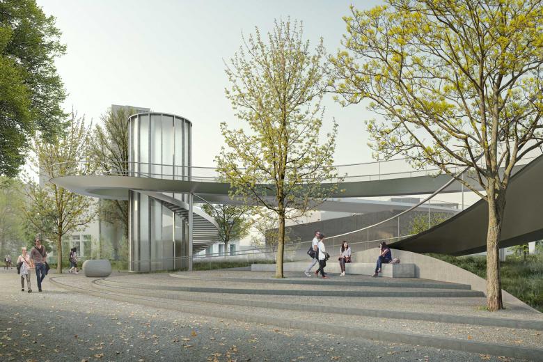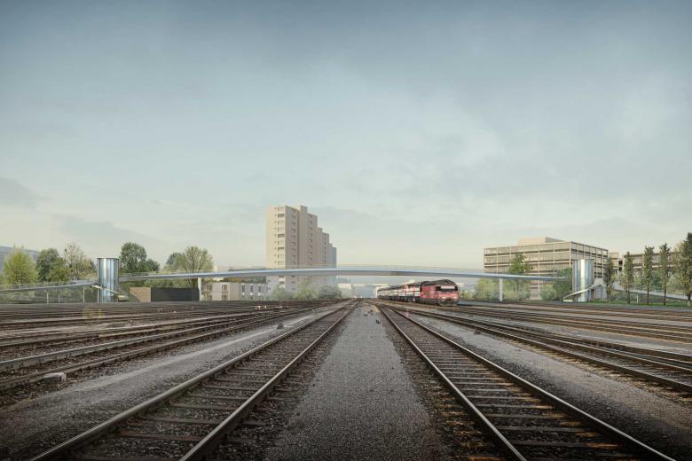 Die Fussgänger- und Fahrradbrücke in Bern Ausserholligen wird an den topographisch höchsten Punkten des Perimeters angeordnet und überspannt das Gleisfeld an der schmalsten Stelle mit 93 Meter Länge stützenfrei. Die Abgänge an den beiden Enden antworten auf die Umgebung und sind verschieden ausgebildet. Während die Velorampe im Norden sich in einer sanften Welle in den Park der Hochschule einfügt, überquert sie im Süden den neu gebildeten Platzraum in einer Achterfigur. Dank der weichen Formgebung offenbart sich das Bauwerk als Architektur der Bewegung.