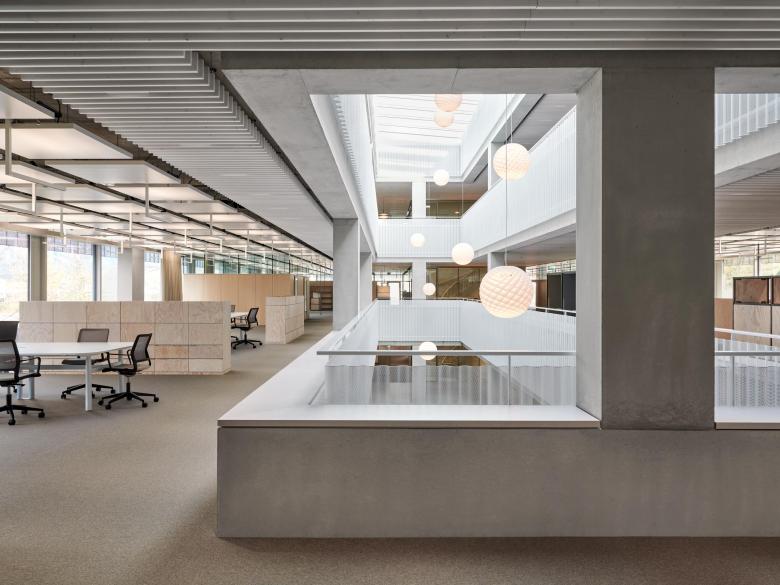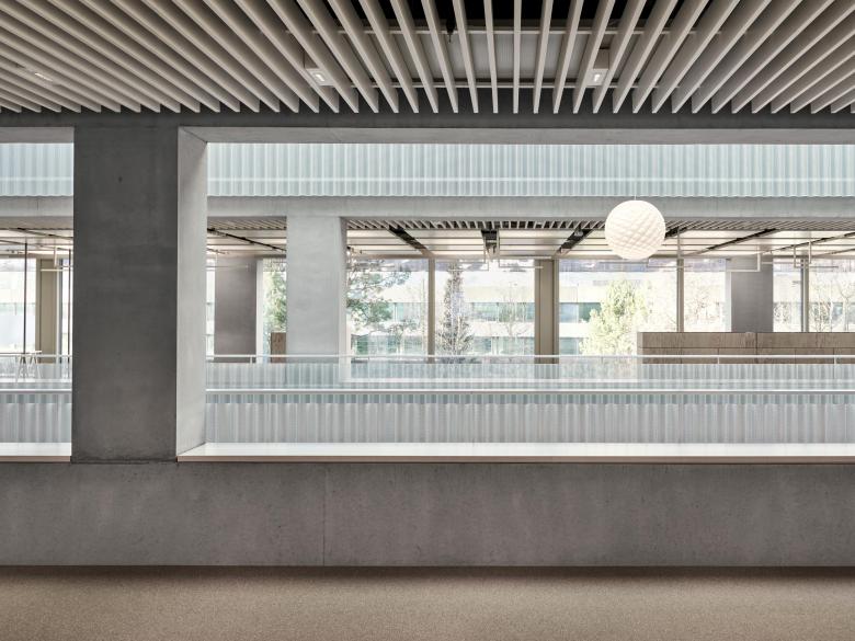 Die Gebäudehülle besteht aus vorgefertigten Fensterelementen und vorgehängten, grosswelligen Lochblechbänder. Das Innere wird geprägt durch eine robuste Primärstruktur in Sichtbeton, eine systemgetrennte Gebäudetechnik mit abgehängten Akustikkühlsegeln, welche auch als Reflektoren für die indirekte Beleuchtung dienen, sowie Trennwänden in furnierter Esche.