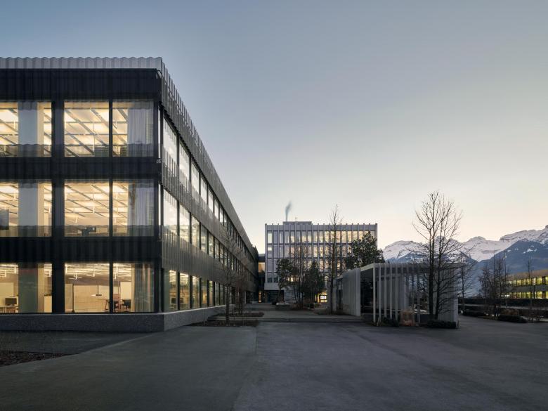 Das Bürogebäude Office Mitte bildet den dreigeschossigen baulichen Hintergrund des Vorplatzes anstelle der ursprünglichen Industriehalle. Innerhalb des neuen Campus Hilti, entsteht mit den angrenzenden Gebäuden ein aufeinander bezogenes Ensemble zwischen Park, Vorplatz und Feldkircherstrasse.