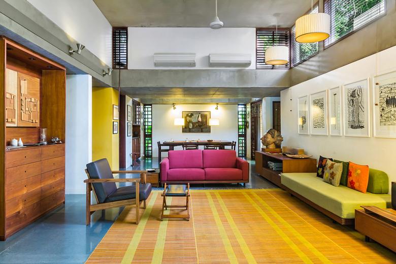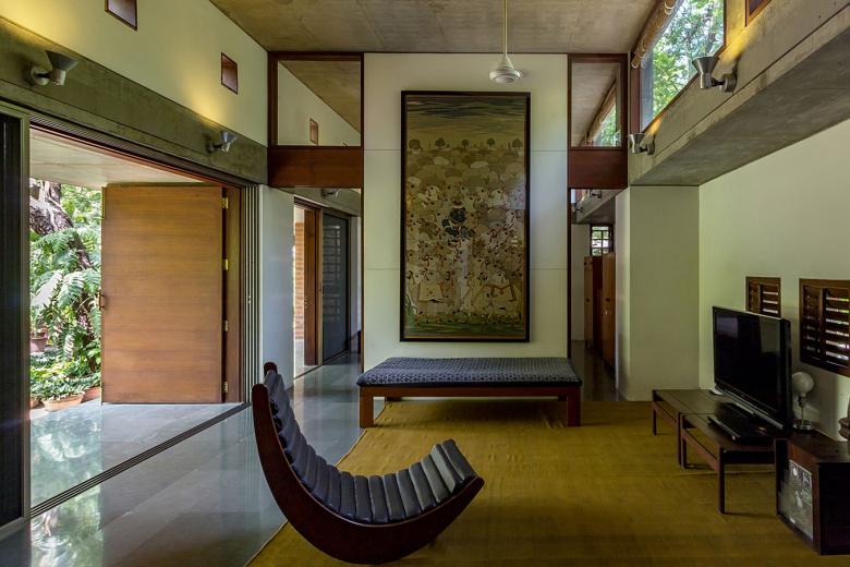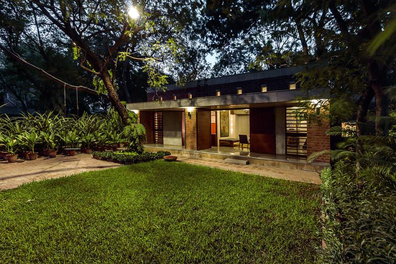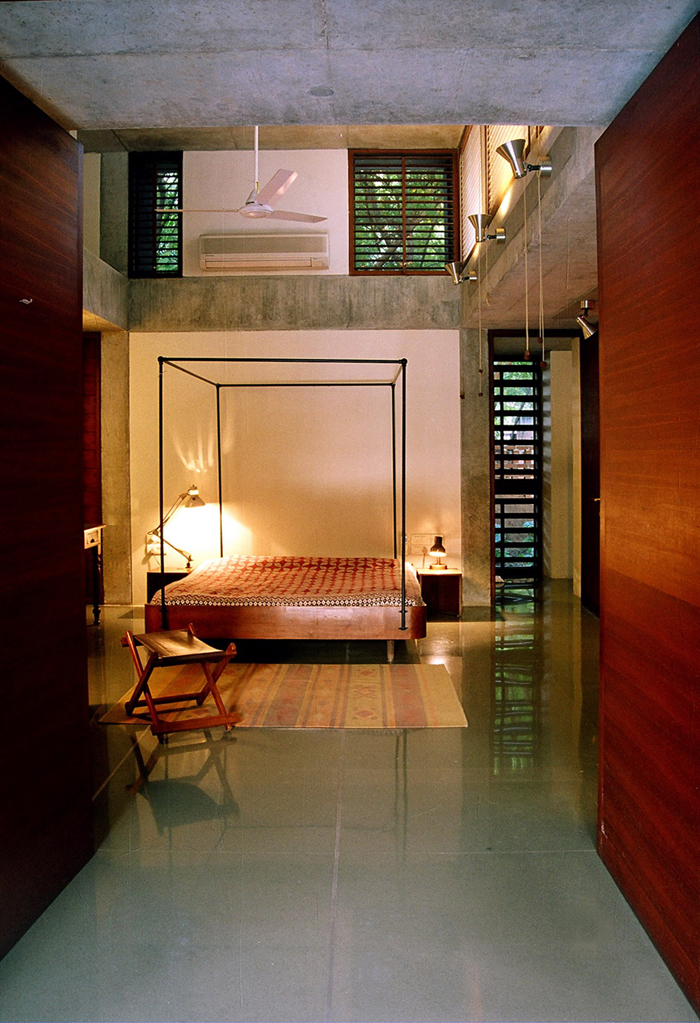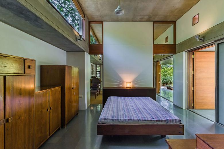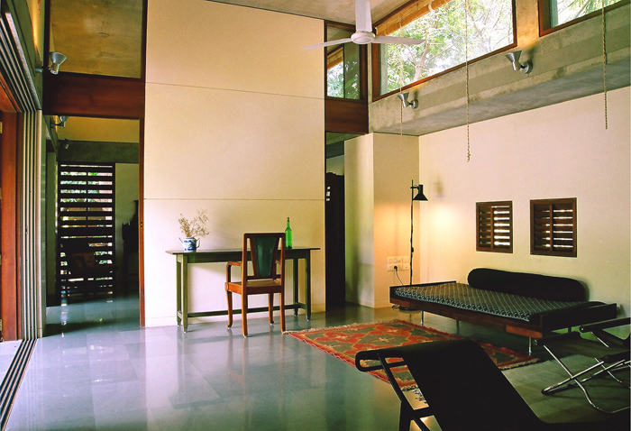 The architect couple had envisioned a minimalistic and tranquil dwelling nestled in a lush landscape. Accordingly, the house is designed as a linear building along the rear edge of the plot with a large garden in the front dotted with shady trees. There is a certain ease and informality about the house and it doesn’t exhibit any hierarchy of spaces. Instead, each space opens onto a low verandah overlooking the garden, while still retaining its privacy and intimacy. The garden forms an integral component of each space and is framed by the low verandah. From the entrance portico, a narrow corridor leads to the living dining areas. From there, a longer corridor, lined with book shelves connects to the bedrooms. The roof over each space is lifted to facilitate natural ventilation and entry of daylight. There are no windows in the house, but only large glazed doors and louvered panels which regulate light and air.