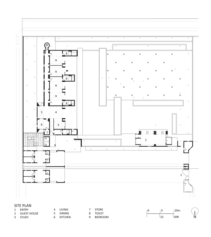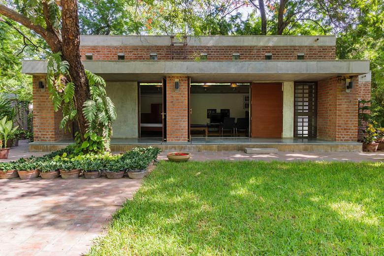 Bimal Patel’s own house, designed in collaboration with architect – furniture designer wife, Ismet Khambatta, is sited on a rectilinear 3022 sq.m. plot in Rambaug, off S G Highway. It is a single storeyed structure and provides a built-up area of 604 sq. m. including the guest house and servants’ quarters.