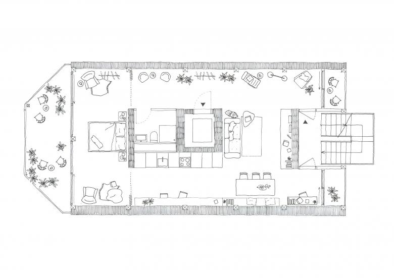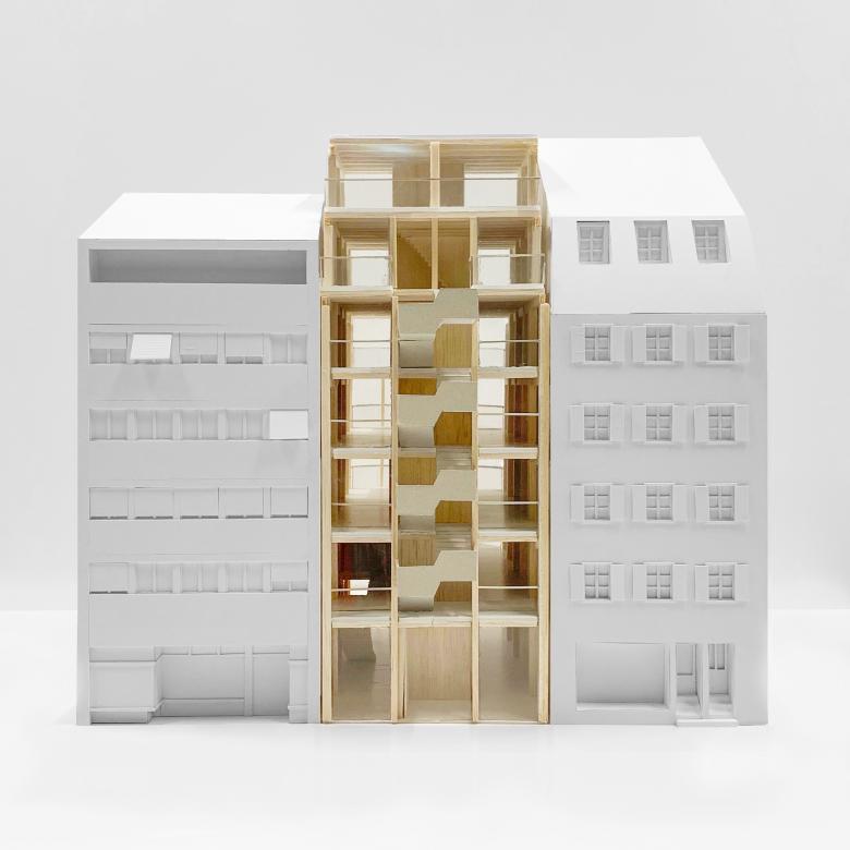 Die Strassenfassade ist durch die markante skulpturale Treppe geprägt. Sie ergibt sich aus dem Baurecht: Ein Drittel der Fassadenlänge darf für über die Baulinie hinausragende Erker oder Balkone genutzt werden. Die Aussentreppe bildet das verbindende Element der Wohnungen des Townhouse untereinander und schafft eine Abstufung zwischen privatem Raum im Inneren und öffentlichem Raum zur Zürcherstrasse und zum Park.
