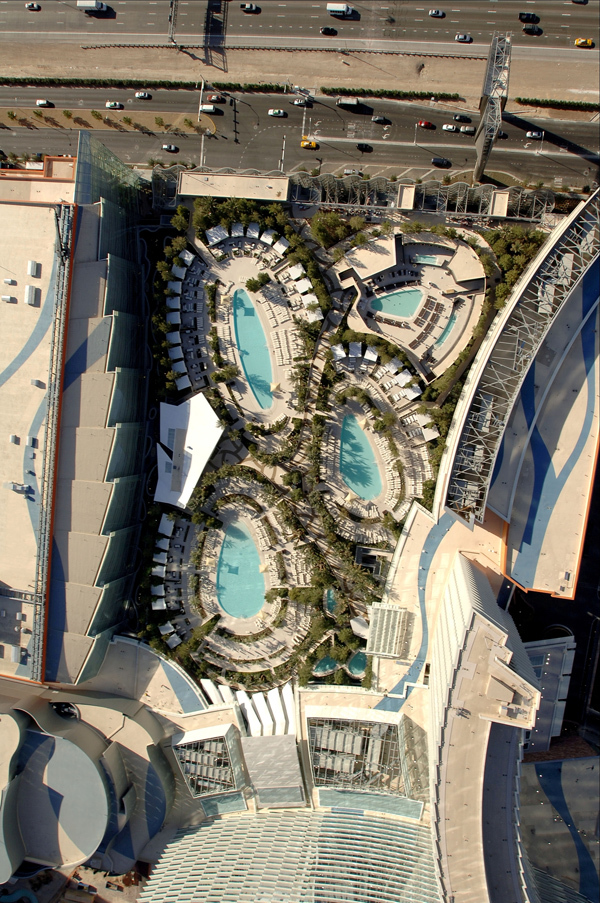 JCFO designed and oversaw construction of a series of unique open spaces including a large pool deck, convention center roof garden, porte cochere, and nightclub patio in addition to all site perimeter streetscape and drop-off areas for MGM’s new 75-acre development in Las Vegas, Nevada. The main pool deck is 300,000 sf with three large pools; an adult pool, three Jacuzzis, 32 custom cabanas and capacity for up to 1,500 guests in a lush setting of tropical and desert vegetation.  Each pool area is shaped as a softly rounded ellipse, or pod-like enclosure, with distinctive planting themes: there is a “yucca pool,” an “acacia pool,” and a “palm pool.”  The main circulation paths are defined by verdant plantings of palm, acacia, and pine, with a group of large sculptural bottle trees accenting the center along with a distinctive water feature – three large, leaning stone jars that pour water onto a bed of round stones - providing a refreshing, cooling sound.
