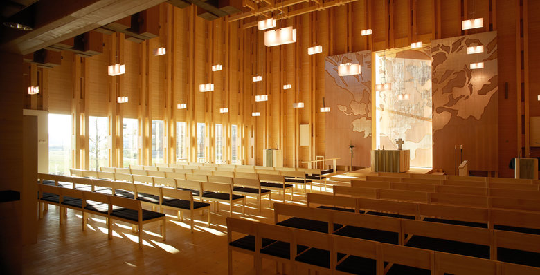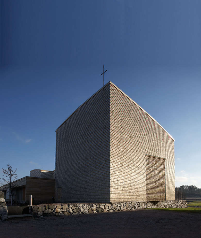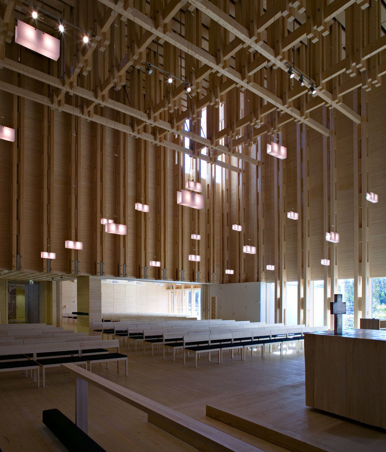 The church is located at the termination point of a narrowing landscape space, along the edge of a new square. The architecture evokes impressions of the Finnish forest. The eaves following the roof shapes reflect the forms of the treetops surrounding them. The approach to the church from the square takes a route past the bell tower and arrangements of vines. In the halls of the building the rising lines of the timber structures, resembling foliage, meet the systems of beams that define the space with light filtering through the structural members. The spaces, made of a single material, are hollowed out within the building like clearings in a forest.