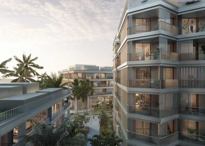 The urban design of King’s Dock Village is a composition of three building types – the Courtyard, the Tower, and the Villa – grouped around a sequence of semi-public spaces with lush vegetation along King’s Dock. The buildings gradually step down, following the view corridor from Mount Faber to the water. The design results in varying building heights and scales, providing an attractive skyline and unique atmosphere around each building. The buildings’ architectural concept offers porosity and permeability through the relief of communal gardens, balconies, and sun-protection filters. The facades vary in their orientation, shape, and external sun screening selection. These form a dynamic double layer, providing privacy and protection while contributing to the cooling of the facades. The rooftops are designed as green surfaces, retaining rainwater and working as insulation. The design offers a broad range of residents’ services and includes a variety of green spaces, including a central garden promenade that connects all entrance lobbies.