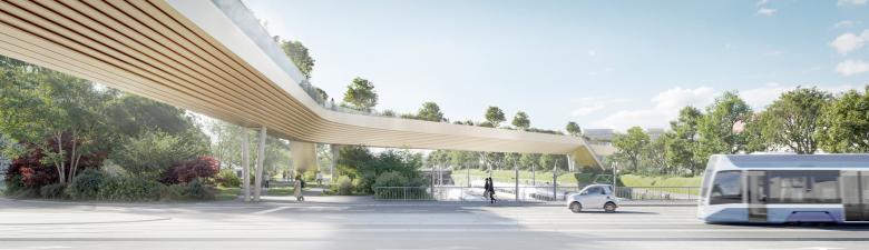 Das Konzept schützt und vergrößert den bestehenden Baumbestand, indem zusätzliche Bäume gepflanzt werden. Die historische Allee auf der Hohenbergstraße wird auf der Bücke weitergeführt. Die grüne Brückenallee verknüpft die beiden Stadtteile, indem die bestehenden Grünflächen zusammengeschaltet werden. Die Parks an den beiden Seiten binden die Brücke städtebaulich ein. »Unterm Kronendach« am Schedifkaplatz bietet eine multifunktionale Begegnungsstätte mit natürlicher Beschattung. An der Hohenbergstraße verbessert der »Wasserpark« mit Liegewiese und Wasserbiotop das Mikroklima und bietet Erholung. Klimafeste Baumarten und Stauden verbessern das Mikroklima und fördern die Biodiversität. Prinzipien der Kreislaufwirtschaft werden durch Wiederverwendung von Bodenaushub und Holzmaterial berücksichtigt.