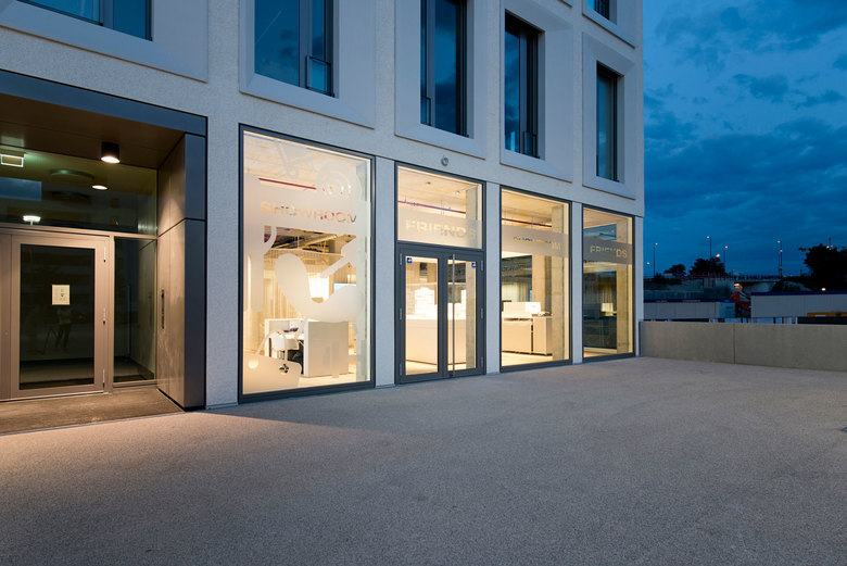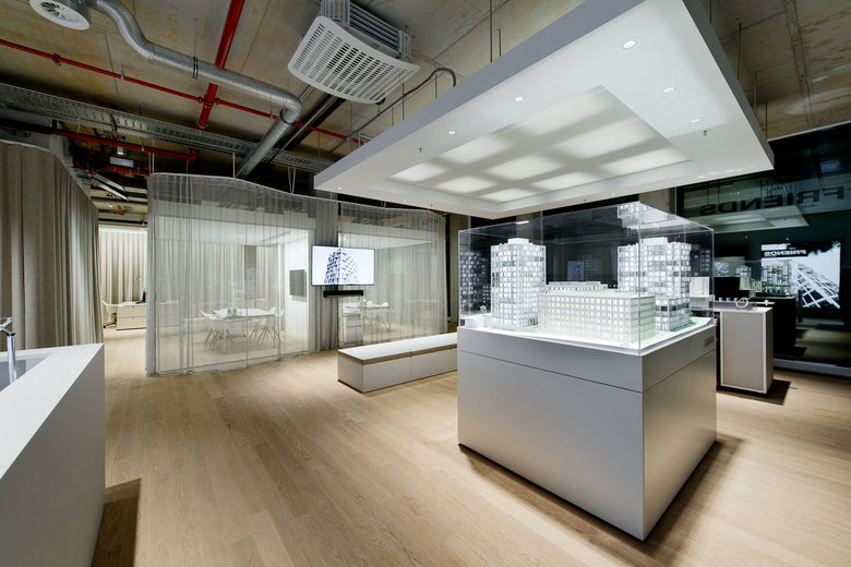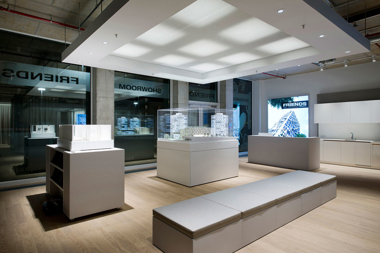 Im Showroom Friends werden Wohnungen verkauft. Dieser Showroom liegt direkt an dem Quartier, das neu bebaut wird, damit die Kunden das Entstehen ihrer neuen Immobilie, mit dem Namen „Friends“ verfolgen können. Ein Ort der Information und Beratung, aber auch ein Ort, der Wohnlichkeit und Privatsphäre ausstrahlt.