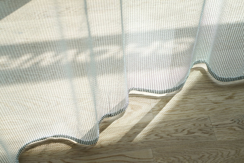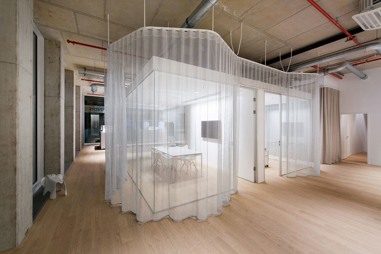 Der Showroom erhielt Ausbauzitate, die später auch in den Wohnungen zu finden sein werden: helle Eichendielen, Raumtrennungen durch Vorhänge in Loden oder transparenten Stoffen, auch eine edle Designküche wurde platziert.