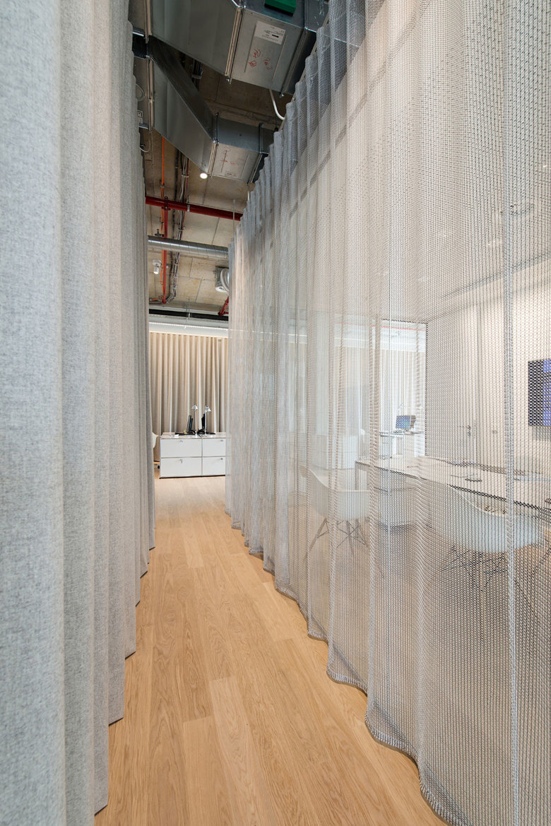 Den repräsentativen Businesscharakter erhält der Raum durch die offen Struktur, eine Raumhöhe von 3,90 Metern und die großen Glasfronten. Um die temporäre Nutzung der Fläche zu zeigen, wurde die Installationseben an der Decke sichtbar belassen.