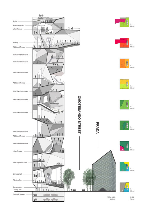 Dispersed, fragmented and instantly repeated. In this new urban experience fashion is not only drove by economic prosperity, but also fueled with the tension of city living: it’s hiding here and showing somewhere else…The Tokyo fashion museum will integrate fashion with the entire city, or, engage the whole city with fashion. It reflects the urban mirage that dispersed into events happening on the streets, in the stations, on top of the buildings; spaces that can observe, move, perform and transform.