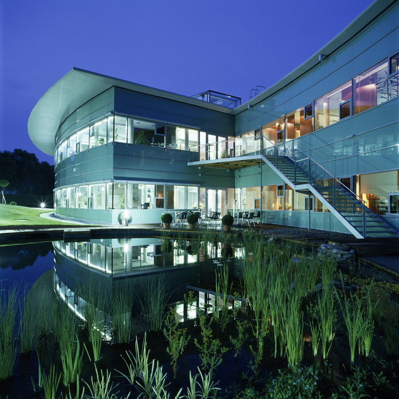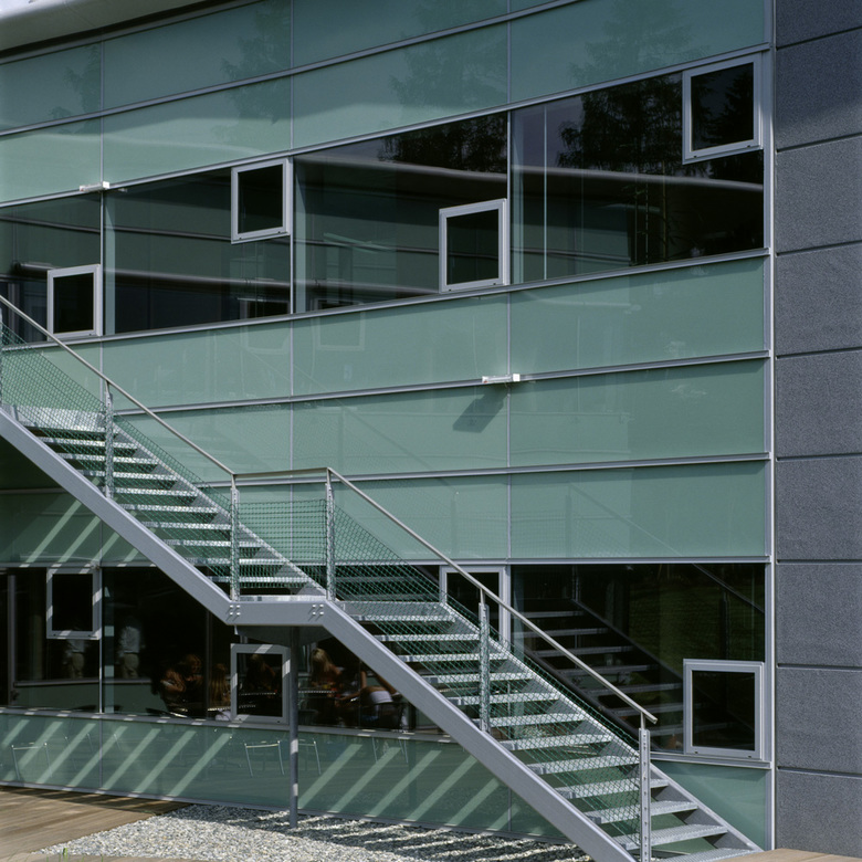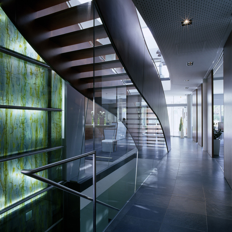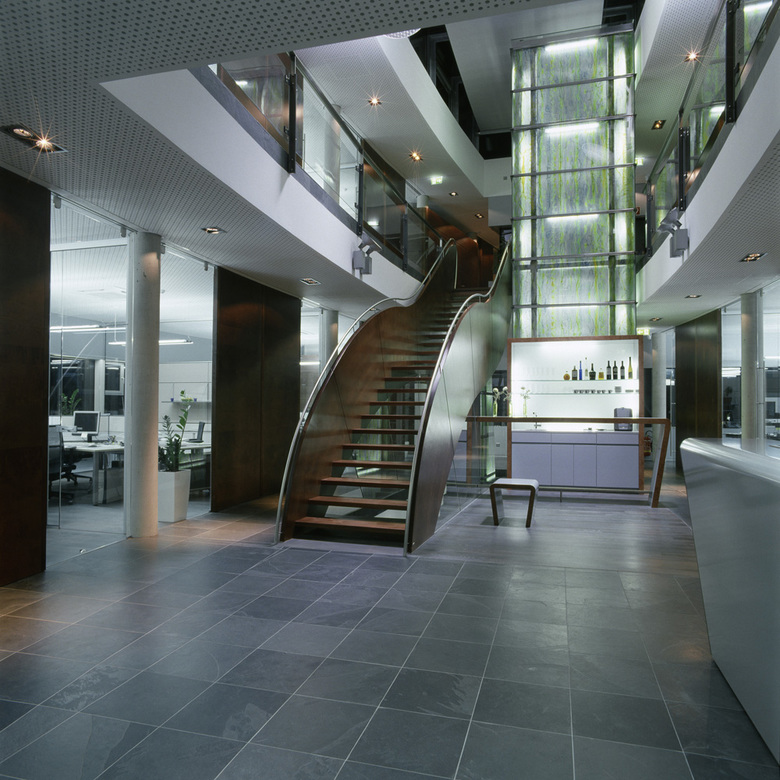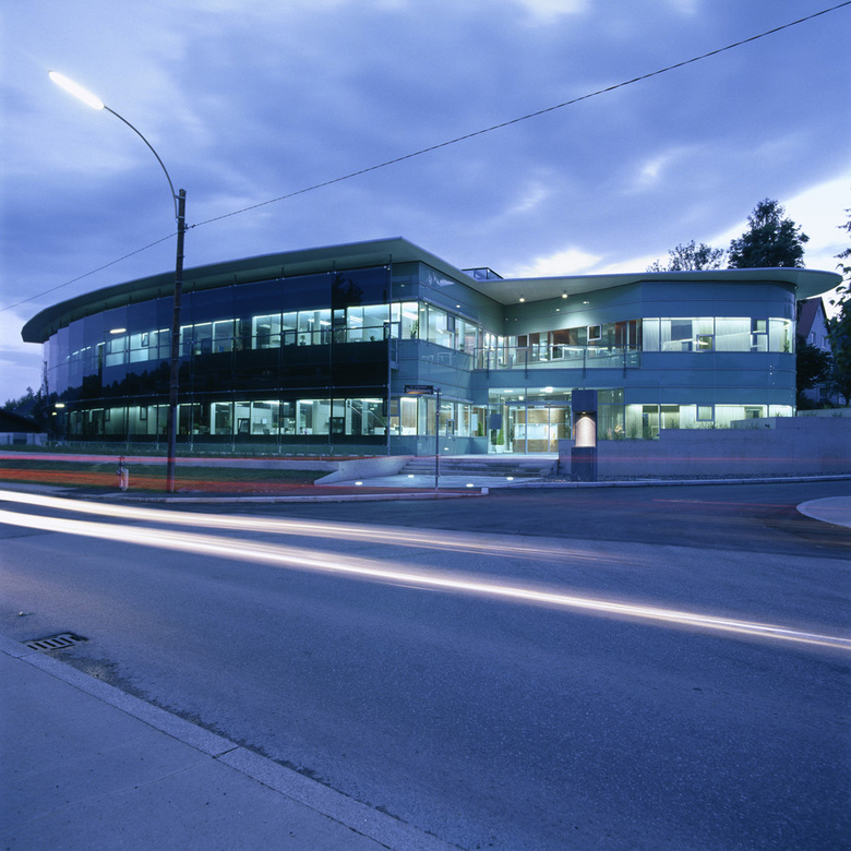 Die geschwungenen Flügel bilden eine zentrale, offene, lichtdurchflutete Halle um die sich alle Gebäudefunktionen gruppieren. Die innere Organisation und Gestaltung des Hauses ermöglicht ein modernes und angenehmes Arbeitsklima.