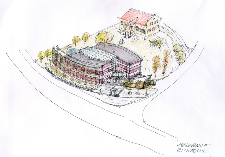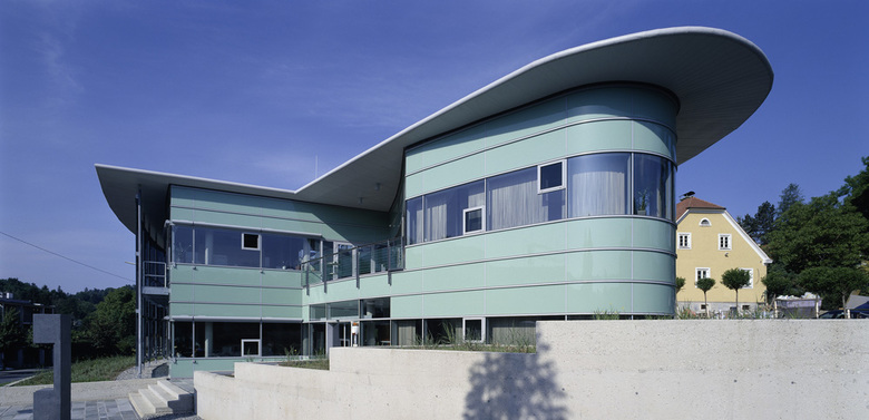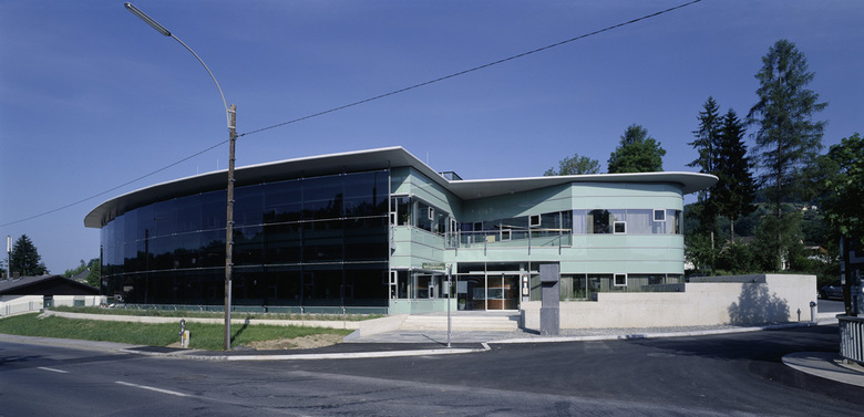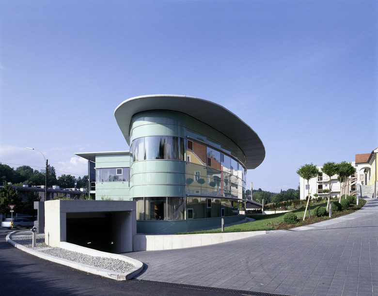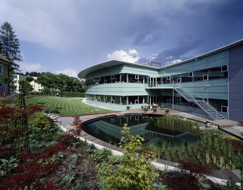 Zwei geschwungene, ineinander verschobene, verglaste Baukörper bilden einen lang gestreckten und dynamischen Bau. Durch den Versatz entstehen an beiden Hausseiten räumliche Zonierungen. An der Ostseite bildet sich dadurch ein Platz, der zusammen mit einem Bildstock und einem getrepptem Wasserbauwerk den Eingang inszeniert. Im Innenhof entsteht ein geschützter Freibereich, der, an einem Biotop gelegen, den Schwellenbereich zum dahinter liegenden alterwürdigen Erzherzog-Johann-Haus bildet.