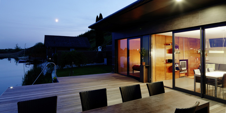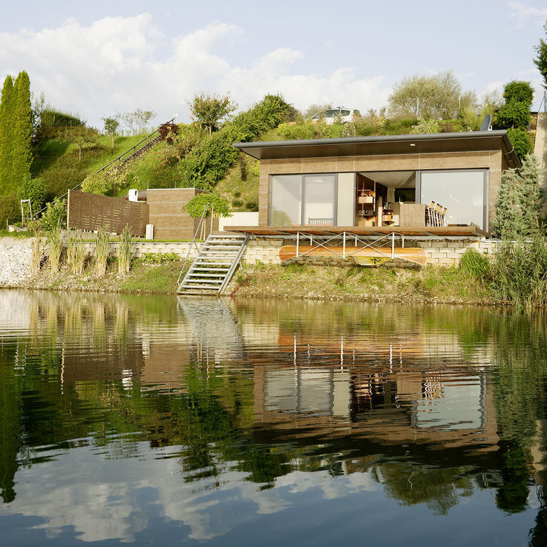 Uferseitig lässt sich der neun Meter lange Bau dank raumhoher gläserner Schiebetüren komplett öffnen wodurch ein fließender Übergang zwischen Schlaf-, Koch- und Wohnbereich und sowie Sonnendeck entsteht. So ergibt sich ein insgesamt fast 100 Quadratmeter großer “Wohnraum”.