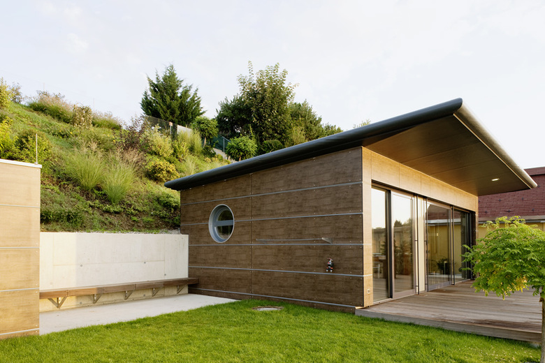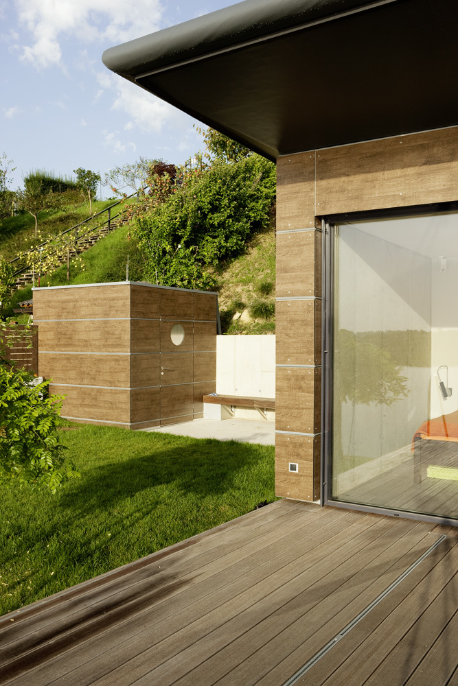 Außen verleihen großformatige Holzwerkstoffplatten dem Bau seine besondere Optik, innen ist es ein Mix aus geschliffenem Sichtbeton, Birkensperrholz-Möbeln und versiegeltem Estrichboden. Die Fassadenplatten tauchen zwischendurch immer wieder in den Möbelstücken auf – etwa beim wetterfesten Tisch auf dem Sonnendeck.