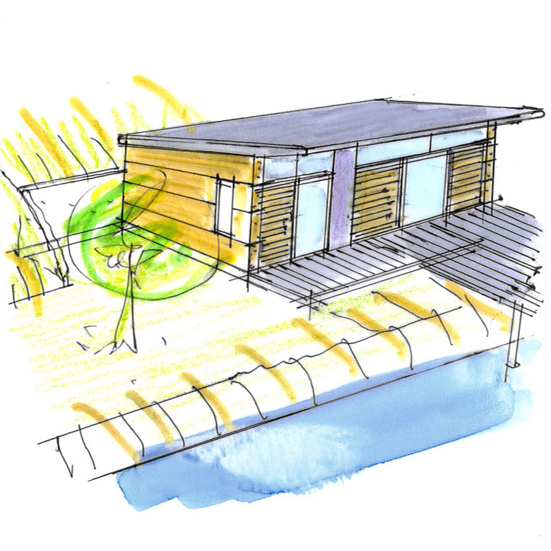 Die Idee für das Seehaus: eine kompakte rechteckige Wohneinheit mit schwach geneigtem Pultdach und einer Fassade, die eine Art Bilderrahmen für die Natur ist.