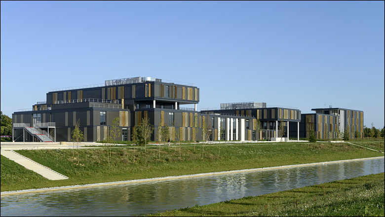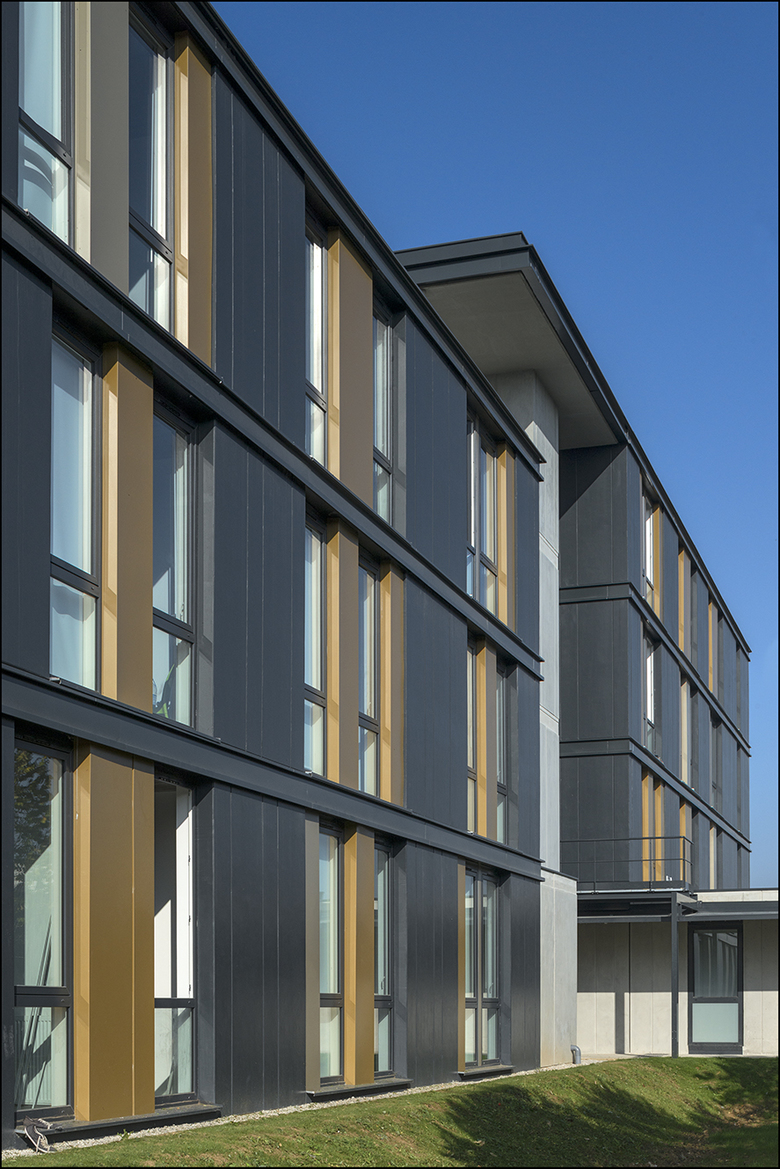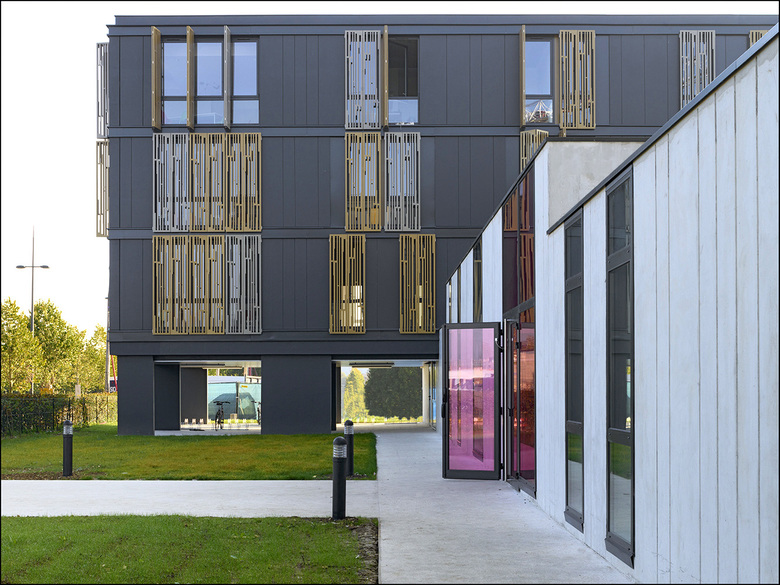 Located in the Carré Sénart urban development zone, a key site for regional tertiary sector development, on the banks of the Canal du Fil d’Eau and bordered by a plantation of lime trees, this project is characterised by a comb type structure which includes offices, a school of engineering and a hall of residence with 312 bedrooms. From an architectural point of view, the orthogonal layout on the ground as well as the building's positioning and the colours and materials used in the cladding on the façades really allow the project to blend in with its surroundings. The simple sliding volumes create a dynamic overall impression. This complex has applied the BREEAM rating "Good" by respecting environmental procedures, focussing on the quality and impact of building materials and the use of integrated eco-systems since conception, as well energy efficiency.