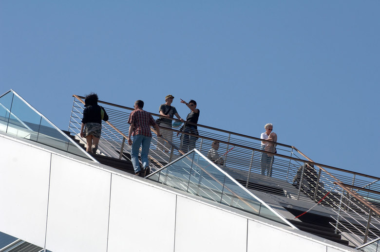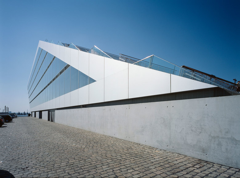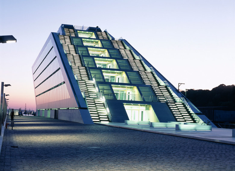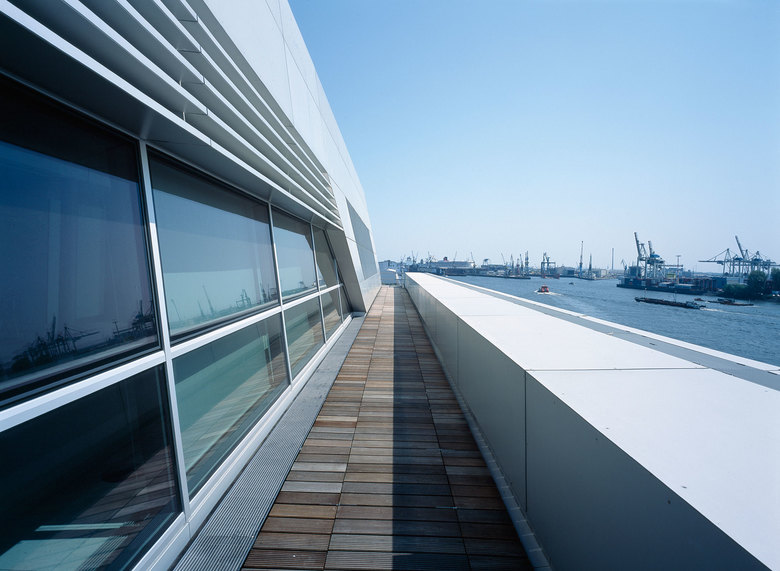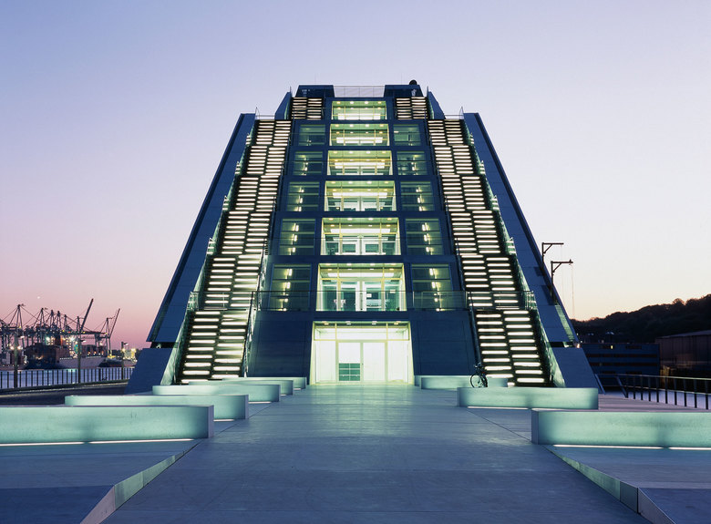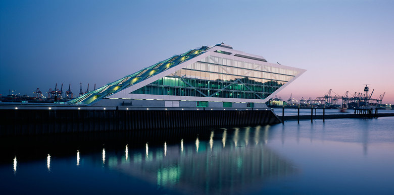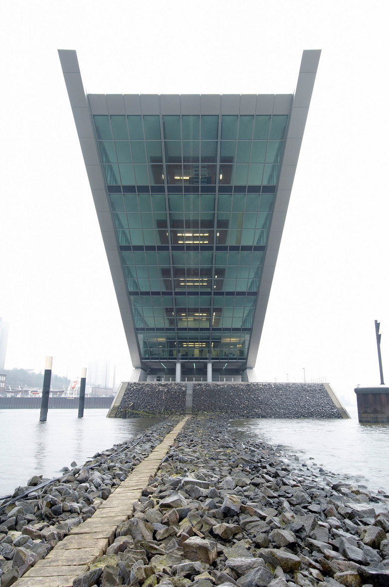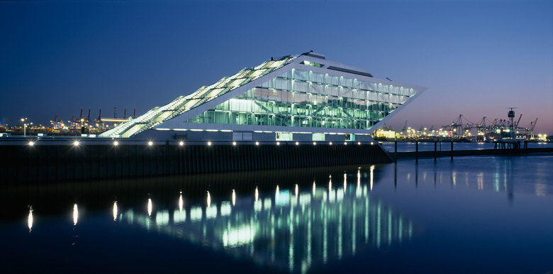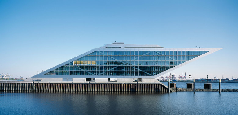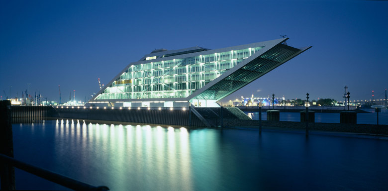 Wie ein Tor zur Stadt Hamburg steht das Dockland-Bürohaus am Kopf des Edgar-Engelhard-Kais zwischen Norderelbe und Fischereihafen. Über 40 Meter kragt der „Bug” des schiffsartigen Baus frei aus und bildet so eine dynamische Ergänzung zum „Heck” des benachbarten Fährterminals. Rund 9000 Quadratmeter Büroflächen bietet das Gebäude, das von einer Stahlrahmenkonstruktion getragen wird. Die Breite des Hauses ermöglicht es, im Mittelbereich Kommunikationszonen wie Teeküchen oder Besprechungsräume aber auch Archive oder Druckerräume anzuordnen. Die großen, offenen Flächen mit frei eingestelltem Mobiliar schaffen eine großzügige Arbeitsatmosphäre. Durch die verglaste Fassade können die Mitarbeiter in ihren Büros den wunderbaren Blick auf das Hafenpanorama genießen. Wem dazu tagsüber während der Arbeit keine Zeit bleibt, kann dies am Abend nachholen: Auf der Dachterrasse in der obersten Etage des Hauses, die auch fremde Besucher über eine öffentliche Freitreppe am Heck des Gebäudes erreichen.