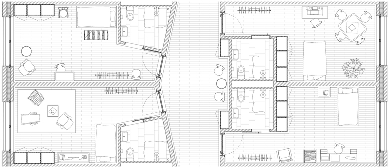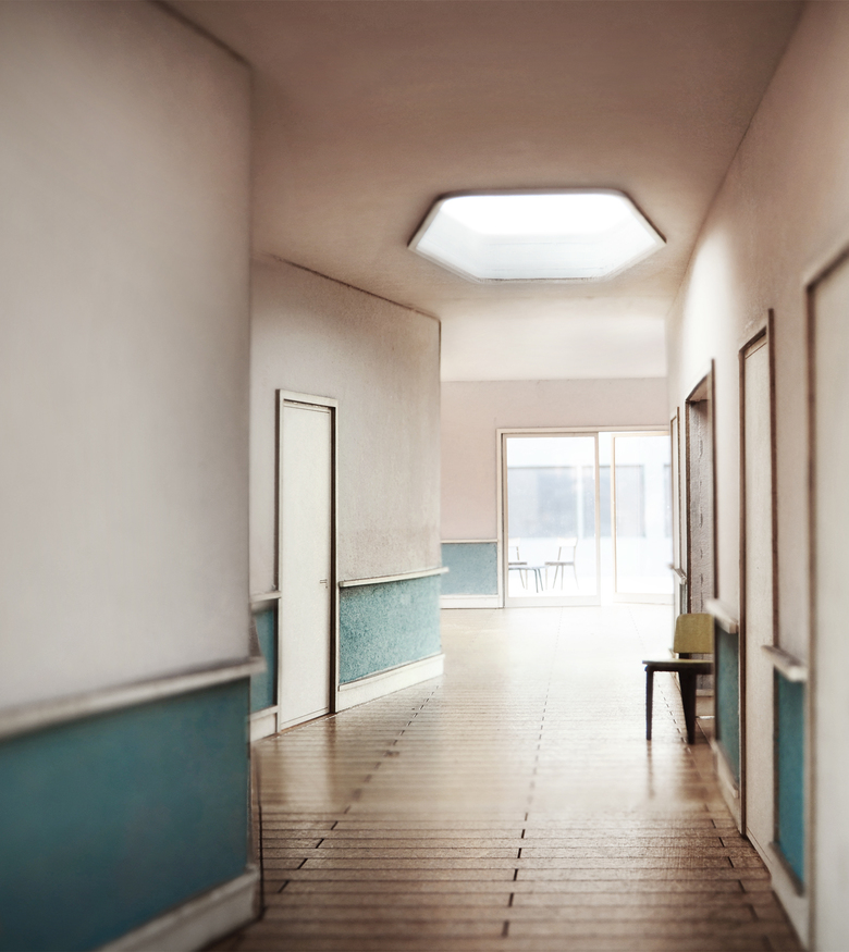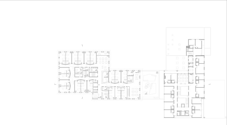 Aufenthaltsbereiche mit Ausblick in die Vorgärten oder Fernblick nach Osten ergänzen das übergeordnete Angebot zum Verweilen. Vier Zimmer teilen sich jeweils eine Korridorausstülpung und eine kleine Sitznische zum Ausruhen.