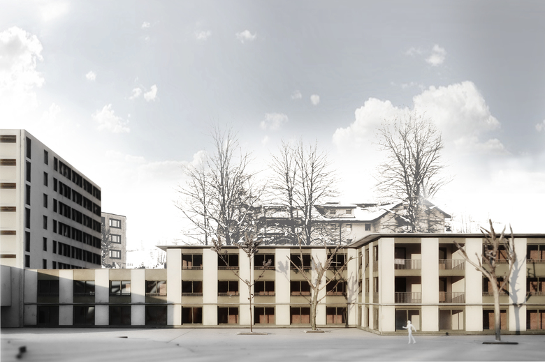 Den Auftakt für das Areal des Altersheims bildet die sich zu den Sportplätzen öffnende Parkanlage im Südwesten. Der Querriegel des bestehenden, dominanten Haupthauses besetzt die Mitte der Anlage. Die projektierte Umrissform ergänzt die Figur mit einem Längsriegel. Der dreigeschossige Baukörper erzeugt zusammen mit der vorgelagerten Parkanlage einen Abschluss des Areals gegen Osten.