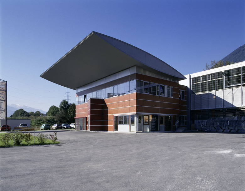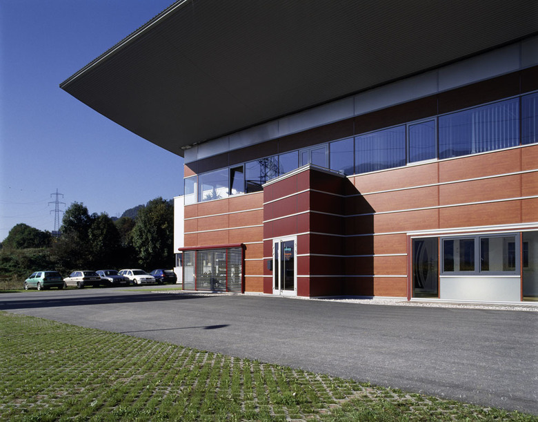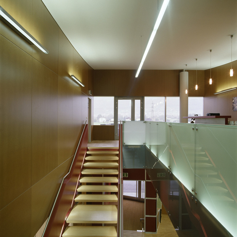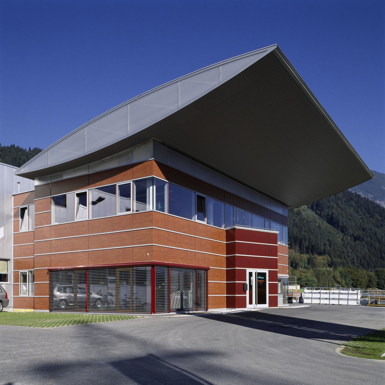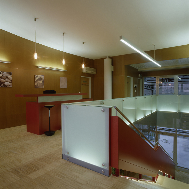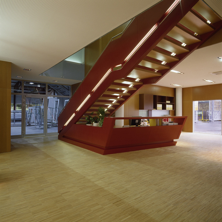 Das zweigeschossige Bürogebäude beherbergt im Erdgeschoss Schauräume, Verkaufsräume und Büros. Über eine markante Eingangsbox betritt man das zweigeschossige Gebäude und kommt in einen nach drei Seiten offenen Raum. Neben dem Schauraum sind im Erdgeschoß auch Verkaufs- und Büroräume untergebracht. Im Obergeschoß befinden sich Personal- und Seminarräume. An den Seitenflächen der Fassade bilden Holzleimbinder die Rahmen zur Präsentation der Fenster und Türen.