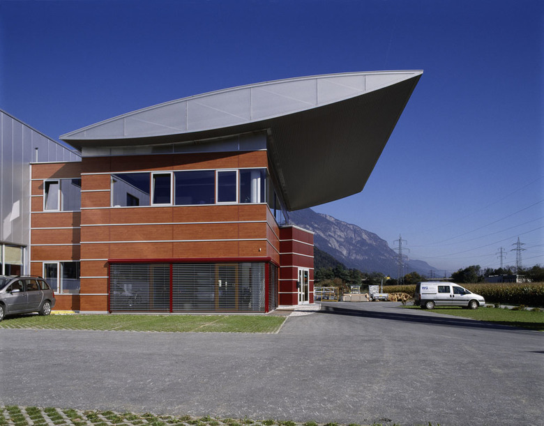 Das weit auskragende flügelähnliche Dach repräsentiert in seiner signifikanten Form das coorperate design der Firma.
