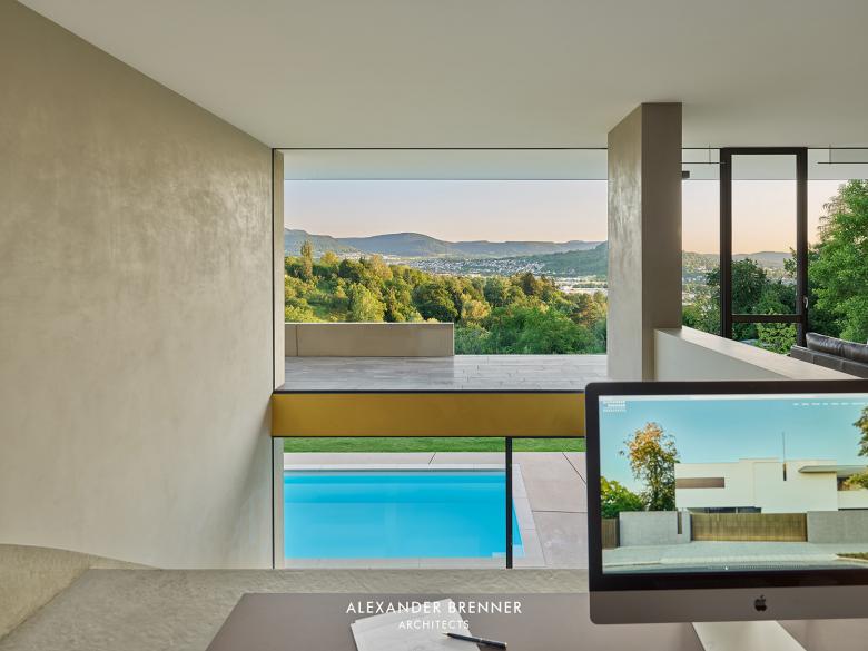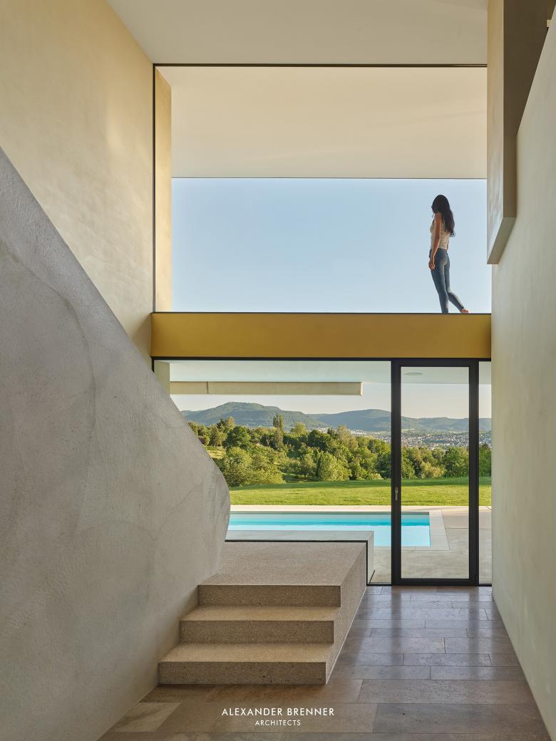 Diese moderne, grosszügige Villa entstand auf einem Grundstück am Rande von Reutlingen an einem beliebten Höhenweg, direkt unterhalb der Achalm. Nach Norden zu diesem Weg hin gibt sie sich steinern, fest und geschlossen und öffnet sich mit raumhohen Verglasungen zur Aussichtsseite im Süden. Hier wandert der Blick über den Pool hinweg über das weite Tal. Aus energetischen Gründen und aus Gründen der Nachhaltigkeit bestehen die Aussenwände aus 50 Zentimeter starkem Porenbeton und einer bearbeiteten Sichtbetonschale von 25 Zentimetern. Durch Zuschlag von lokalem Jurasplitt erscheint sie nach dem Bearbeiten in einem warmen Graubeige. Die handwerklich durch Spitzen, Stocken und Scharrieren bearbeitete Fassade präsentiert sich mit einer rauen, archaischen Reliefstruktur. Auch im Inneren schufen Steinmetze durch den gestockten Beton an Einbauten, Treppen und Brüstungen eine ganz besondere Atmosphäre, die an die steinerne Kraft historischer Bauten erinnert. Das beruhigende Gefühl von Festigkeit und Dauerhaftigkeit verstärken gekalkte Wände, Natursteinboden und Eichenparkett.