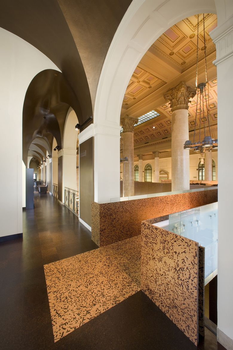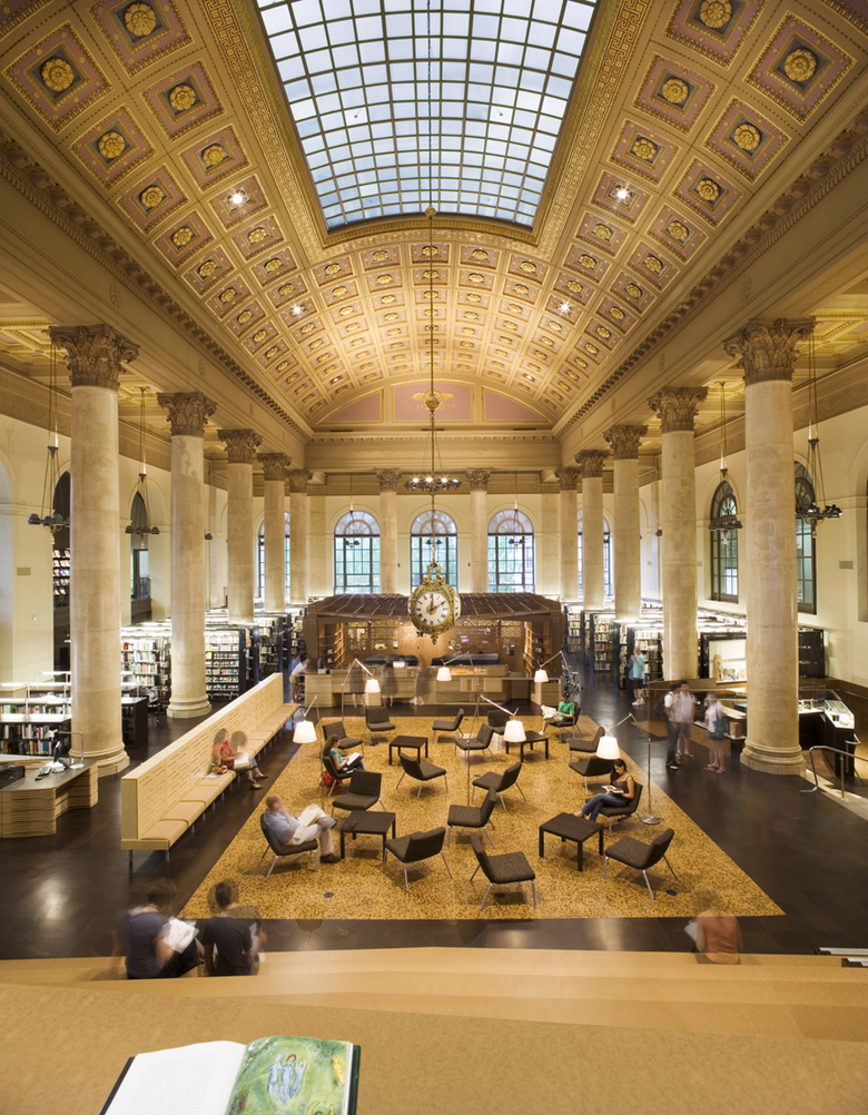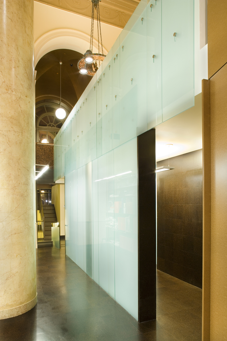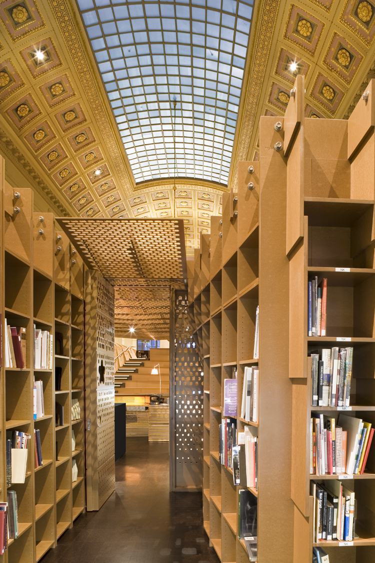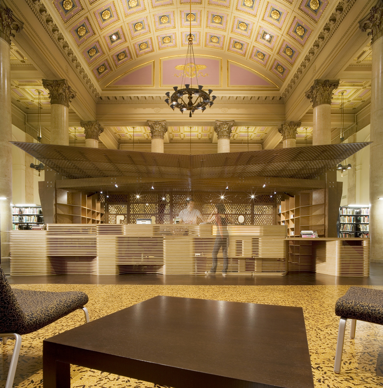 The RISD library houses an extensive collection of art and design volumes, magazines, and multimedia resources. In addition to the vast collection, group study areas, classrooms, a cafe, and administrative offices are included in the program. Organizing the library stacks and infrastructure within the confined space of the lobby, mezzanine, and second floor of a historically preserved bank building presented a great challenge. To overcome the limited floor area, two new pavilions housing key programmatic components were positioned within the void of the barrel vault of the main hall. The inserted objects not only house elements such as the check-out desk and reference book stacks, but make use of every surface to maximize their functionality. For example, one of the pavilions offers seating on a surface as it steps up to a study area that occupies the object’s roof and which, in turn, connects to the existing mezzanine.