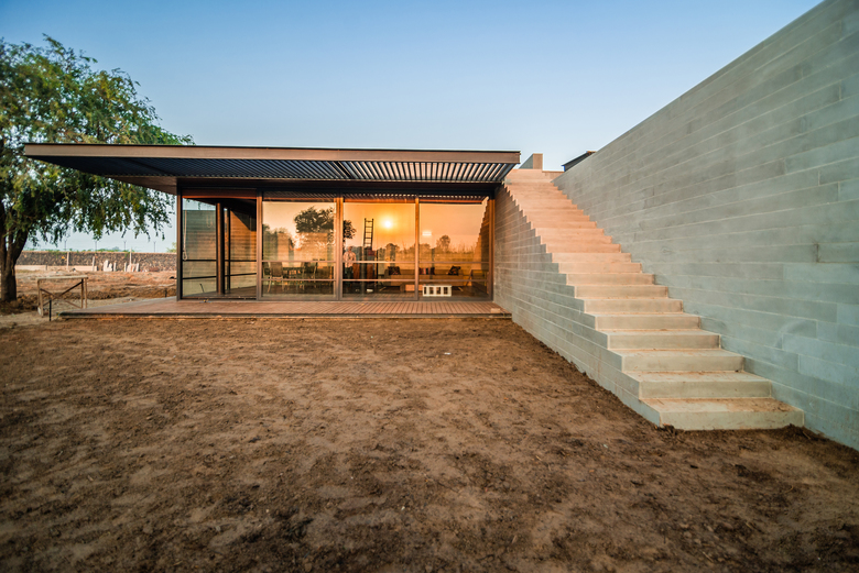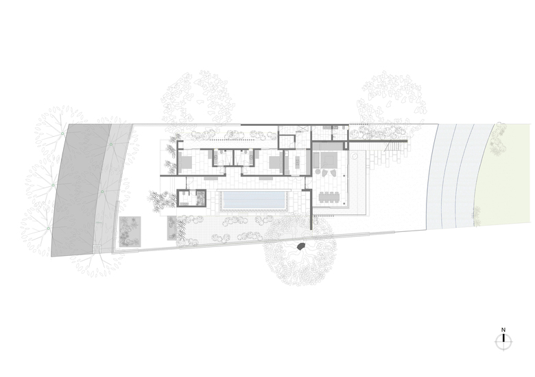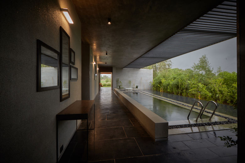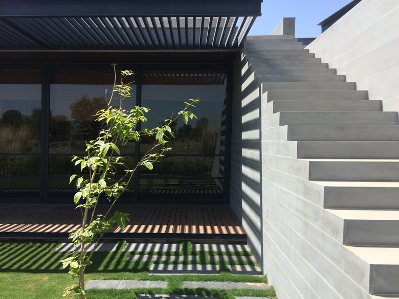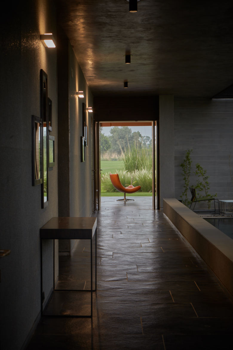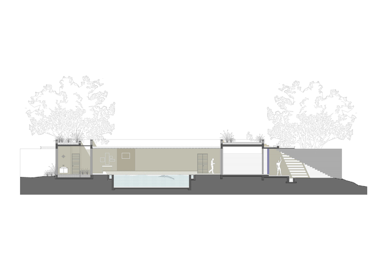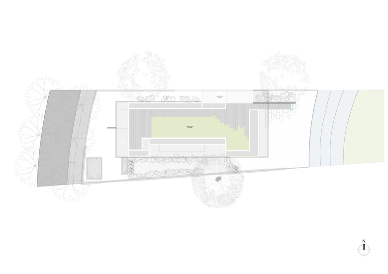 The selected option was further detailed into 4 variants. This particular option was designed so as to minimally disrupt the edge of the fairways, being low slung and flat roofed. In this region mornings as well as evenings are spent under the sky and to promote the same a small feature of a stone staircase was introduced to reinforce the connectivity between the principal living space, the front garden and the green roofed terrace.