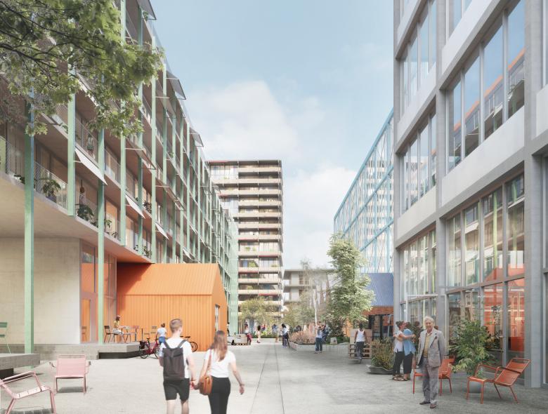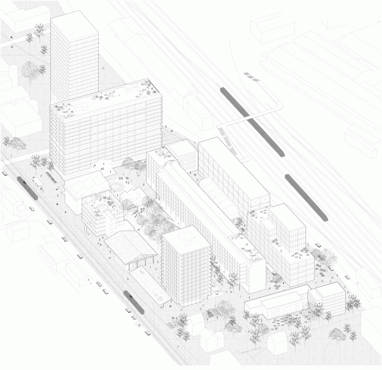 Gegen Süden nimmt die Durchlässigkeit der Ost-West verlaufenden Gebäudestruktur zu. Dadurch entsteht ein dichtes Erschliessungsnetz, welches die Durchmischung und den Austausch zwischen den unterschiedlichen Nutzungen und Angeboten fördert.