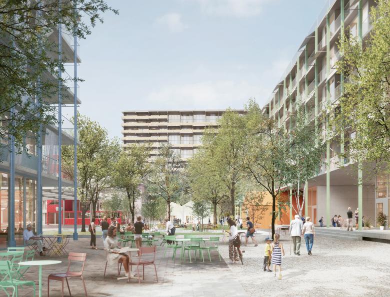 Der zentrale Park bildet mit seiner grünen Üppigkeit das Zentrum, um das sich das Wohnen konzentriert. Die parallel verlaufende Lange Gasse kontrastiert mit ihrer engen, versetzt angeordneten Raumstruktur und der mehrheitlich mineralischen Ausbildung den grossen, vegetativ geprägten Park. Mietergärten, als mögliche Zwischennutzung und Loggien erweitern das Spektrum an Freiräumen.